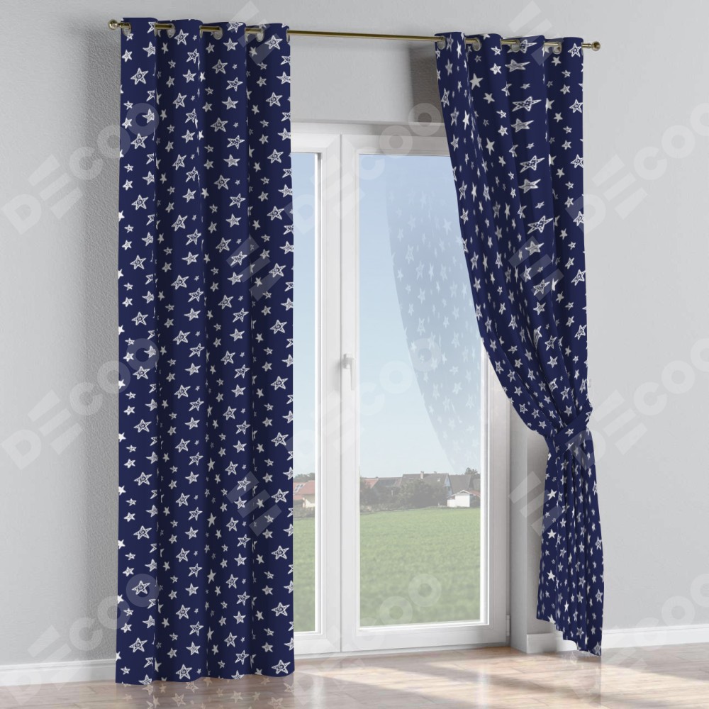 Комплект прямых штор, от производителя «Cortin», пошиты из ткани блэкаут с нанесением сублимационной печати «Ночные звёзды». Данная модель пошита на люверсах, комплектуется на выбор круглым карнизом и подходит для монтажа на стену или потолок. Прямые шторы на люверсах шьются по стандарту с коэффициентом 1/2 (на 100 см. ширины проёма 200 см. ширины ткани), отличительным преимуществом данной модели является простой способ монтажа. Достаточно повесить ее на трубу и штора готова!