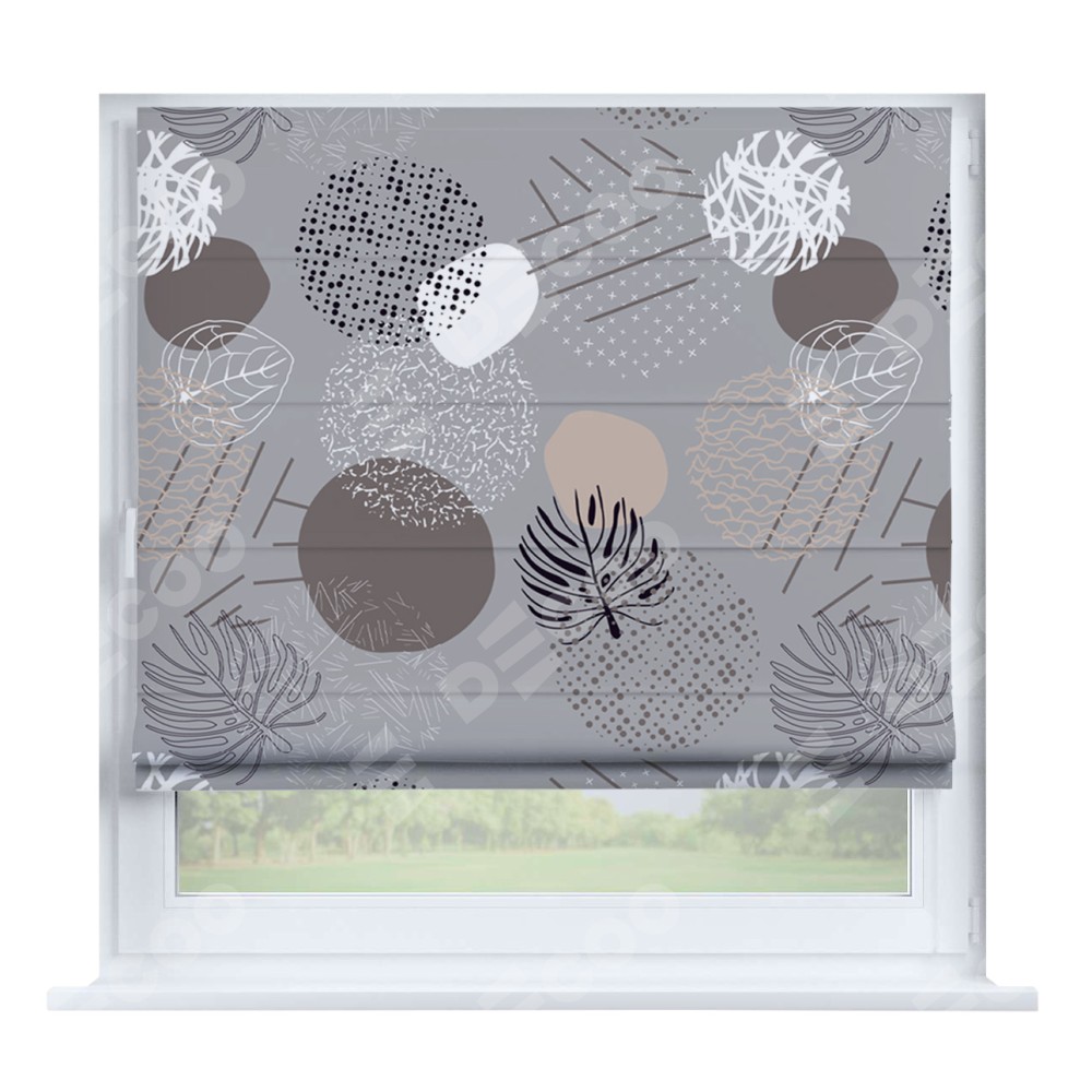 Римская штора производителя «Cortin», устанавливается на створку окна, пошита из ткани блэкаут с нанесением сублимационной печати «Ботаника абстракция». Штора шьётся по индивидуальным размерам, для данного типа римской шторы возможная ширина от 35 до 150 см., высота до 250 см.