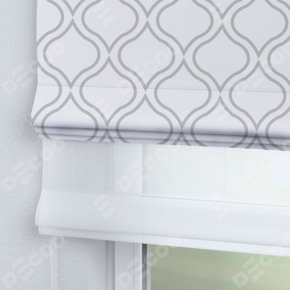 Римская штора день-ночь производителя «Cortin», используется для проёма, пошита из двух полотен, с лицевой блэкаут с нанесением сублимационной печати «Тайны востока белый», вторая ткань тюль (по стандарту комплектуется тюль белого цвета артикул V-01). Имеет универсальный механизм и подходит для монтажа: на потолок, на стену и в нишу.