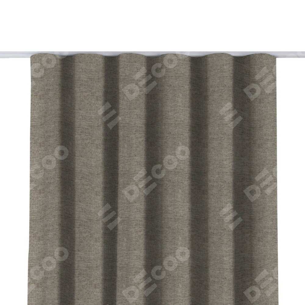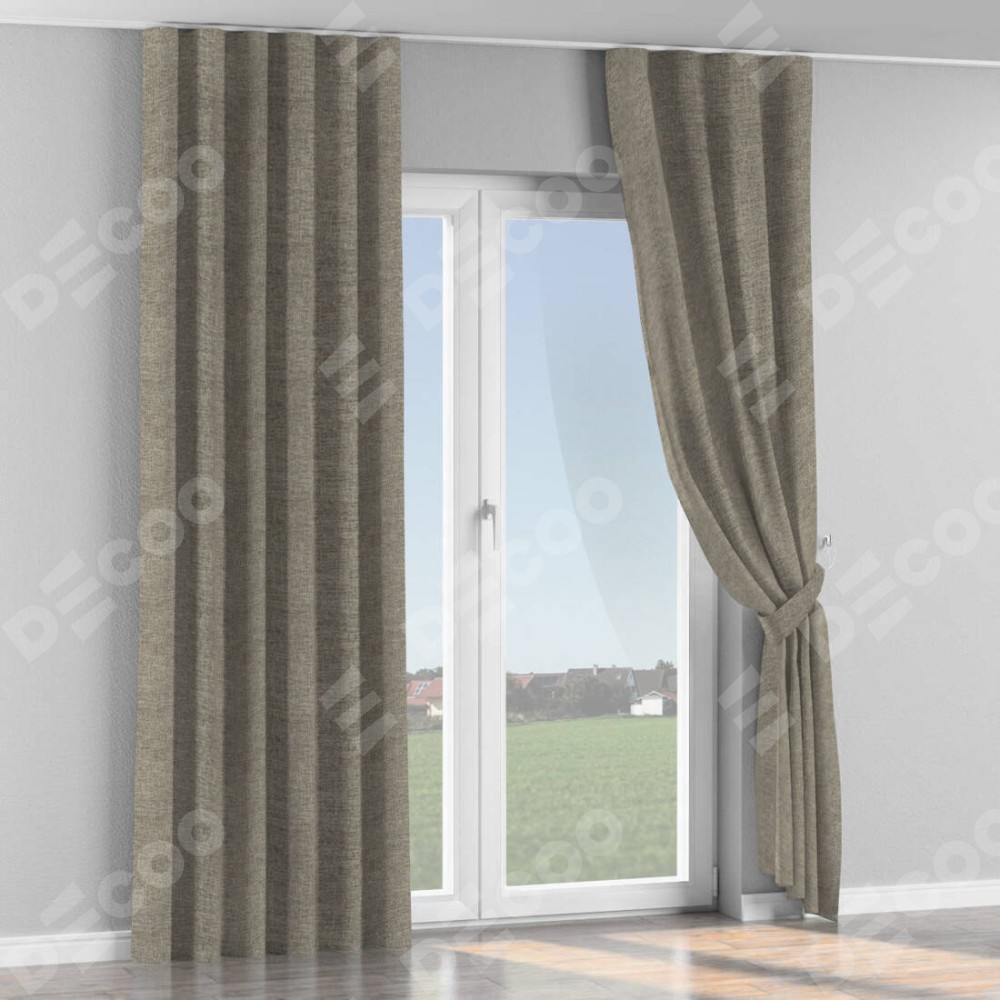 Комплект прямых штор, от производителя «Cortin», пошиты из ткани стиф димаут серо-коричневый, артикул ткани 44028. С изнаночной стороны в верхней части штор пристрачивается шторная лента с декоративными складками «Волна». Для создания элегантных складок прямые шторы шьются по стандарту с коэффициентом 1:2 (на 100 см. ширины проёма 200 см. ширины ткани).
