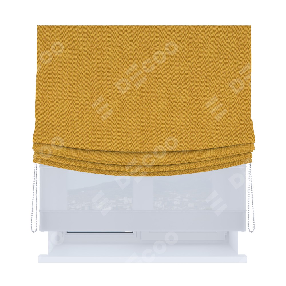 Римская штора день-ночь производителя «Cortin», используется для проёма, пошита из двух полотен, с лицевой стороны твид блэкаут медово-желтый артикул 21641, вторая ткань тюль (по стандарту комплектуется тюль белого цвета артикул V-01). Имеет универсальный механизм и подходит для монтажа: на потолок, на стену и в нишу. Удобное управление каждой шторой отдельно.