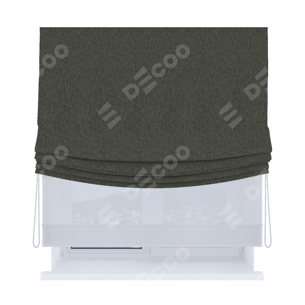 Римская штора день-ночь производителя «Cortin», используется для проёма, пошита из двух полотен, с лицевой стороны твид блэкаут тёмно-серый артикул 21587, вторая ткань тюль (по стандарту комплектуется тюль белого цвета артикул V-01). Имеет универсальный механизм и подходит для монтажа: на потолок, на стену и в нишу. Удобное управление каждой шторой отдельно.