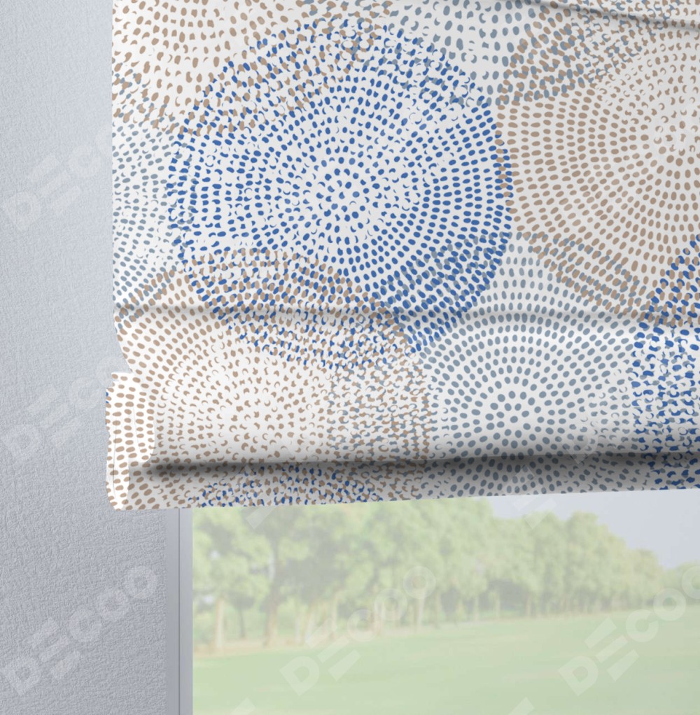 Римская штора производителя «Cortin», используется для проёма, пошита из ткани блэкаут с нанесением сублимационной печати «Абстрактные круги». Данная модель пошита на петлях, комплектуется на выбор круглым карнизом и подходит для монтажа на стену. Римская штора на петлях имеет простую систему регулировки высоты, отличительным преимуществом данной модели является простой способ монтажа. Достаточно повесить ее на трубу и штора готова!