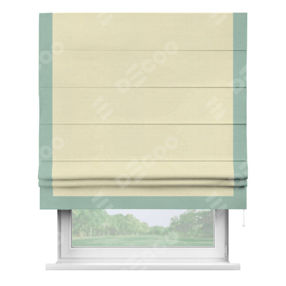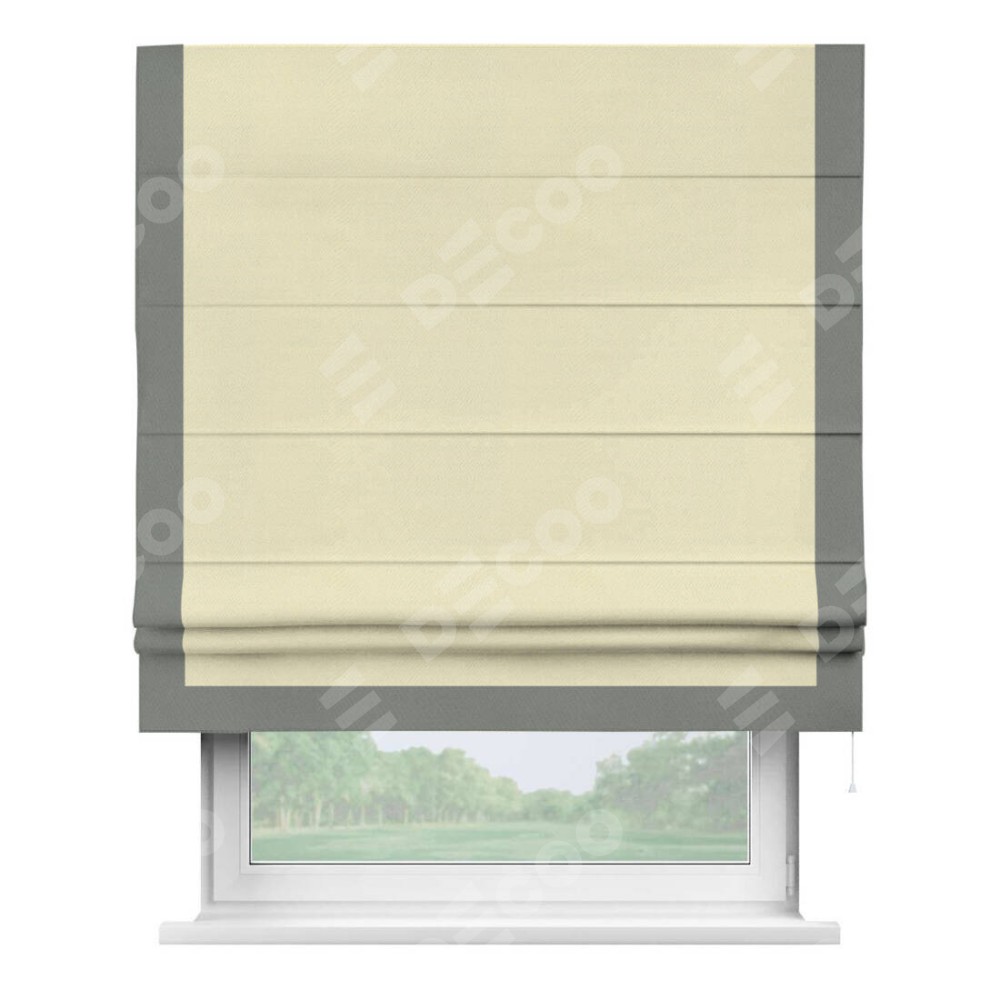 Римская штора производителя «Cortin», используется для проёма, пошита из ткани блэкаут однотонный бежевый, артикул ткани 88283. Отделка шторы кантом «Виктория», ткань для канта используется из блэкаута однотонного разной расцветки на выбор. Имеет универсальный механизм и подходит для монтажа: на потолок, на стену и в нишу.