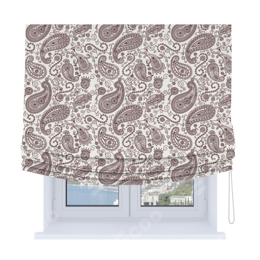 Римская штора Soft производителя «Cortin», используется для проёма, пошита из ткани блэкаут с нанесением сублимационной печати «Индийский узор». Имеет универсальный механизм и подходит для монтажа: на потолок, на стену и в нишу. В отличие от стандартных римских штор, римская штора Soft не имеет горизонтальных вставок и нижнего отвеса. Это позволяет ткани произвольно драпироваться в свободные мягкие складки.