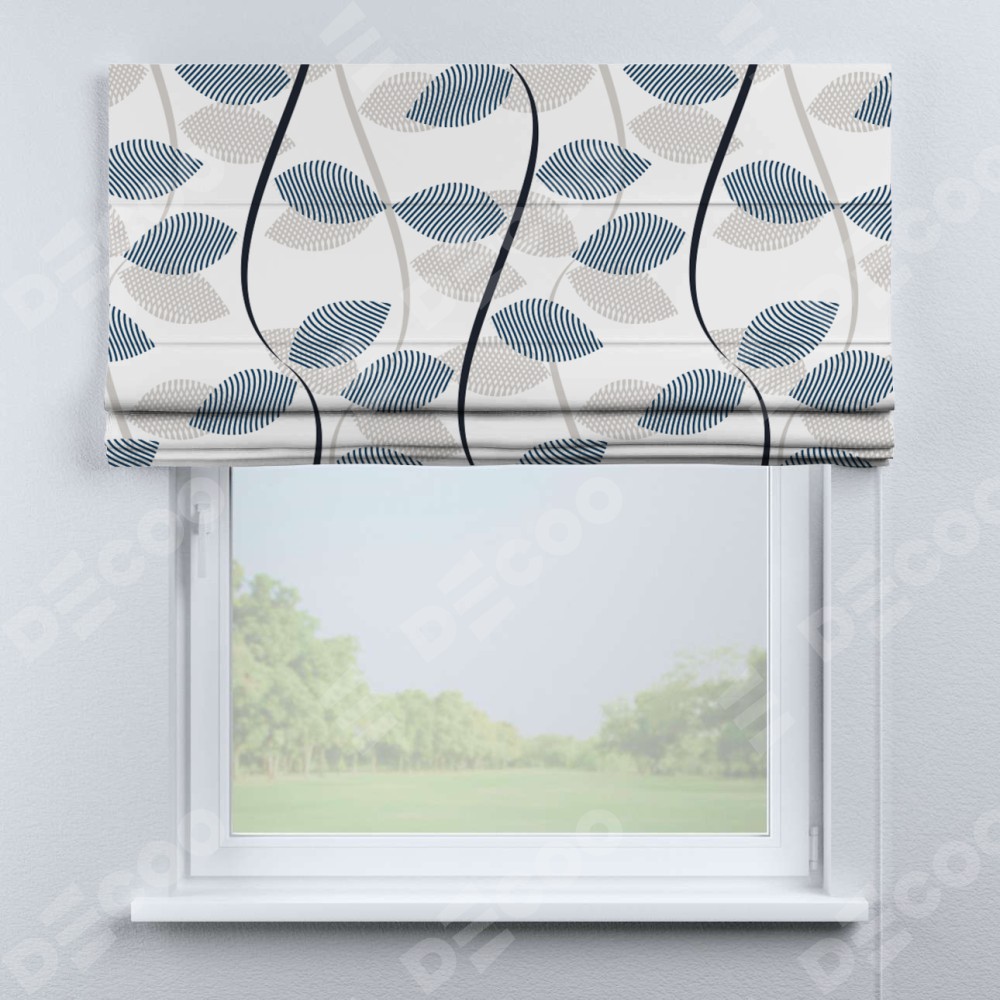 Римская штора производителя «Cortin», используется для проёма, пошита из ткани блэкаут с нанесением сублимационной печати «Резные листья». Имеет универсальный механизм и подходит для монтажа: на потолок, на стену и в нишу.