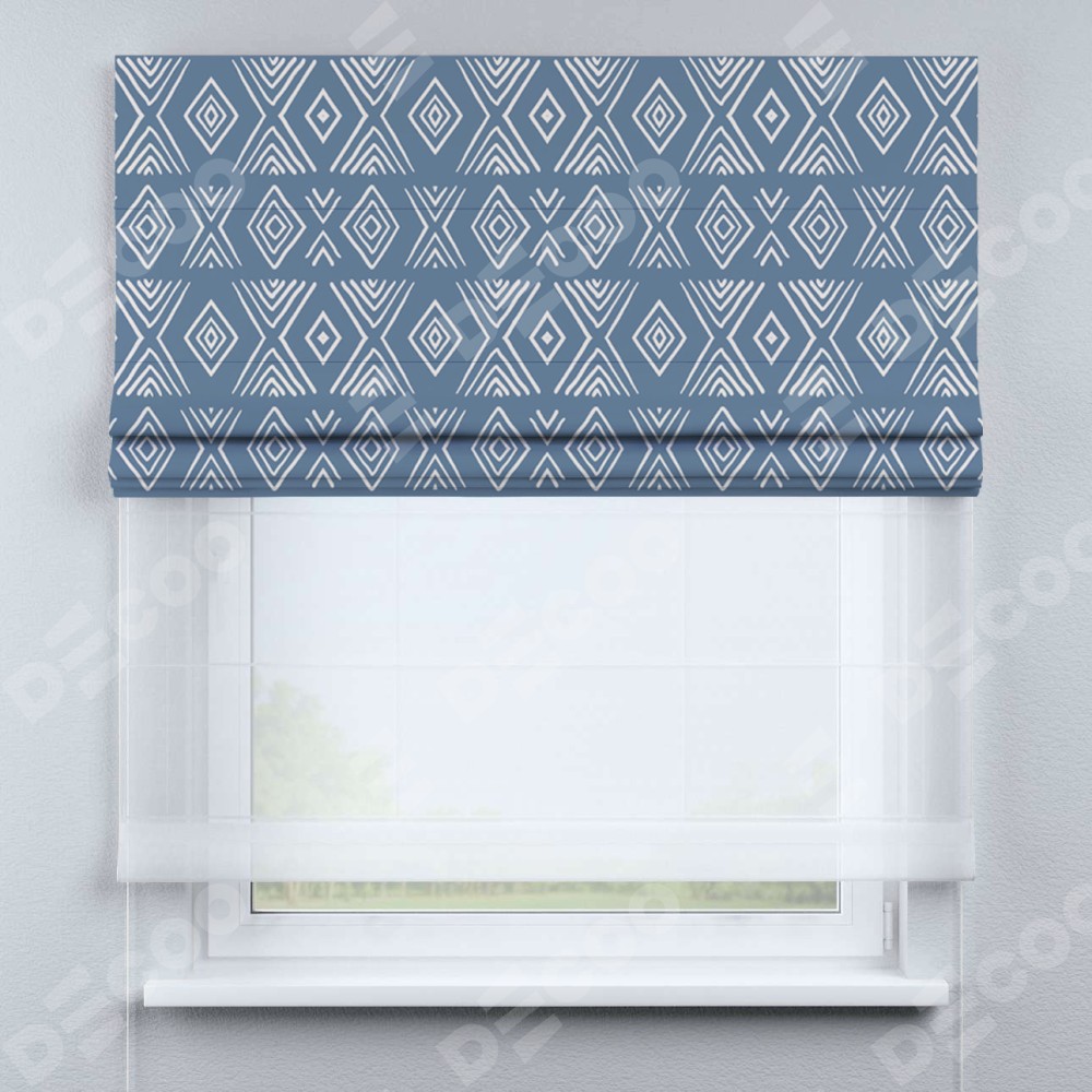 Римская штора день-ночь производителя «Cortin», используется для проёма, пошита из двух полотен, с лицевой блэкаут с нанесением сублимационной печати «Графический орнамент», вторая ткань тюль (по стандарту комплектуется тюль белого цвета артикул V-01). Имеет универсальный механизм и подходит для монтажа: на потолок, на стену и в нишу.