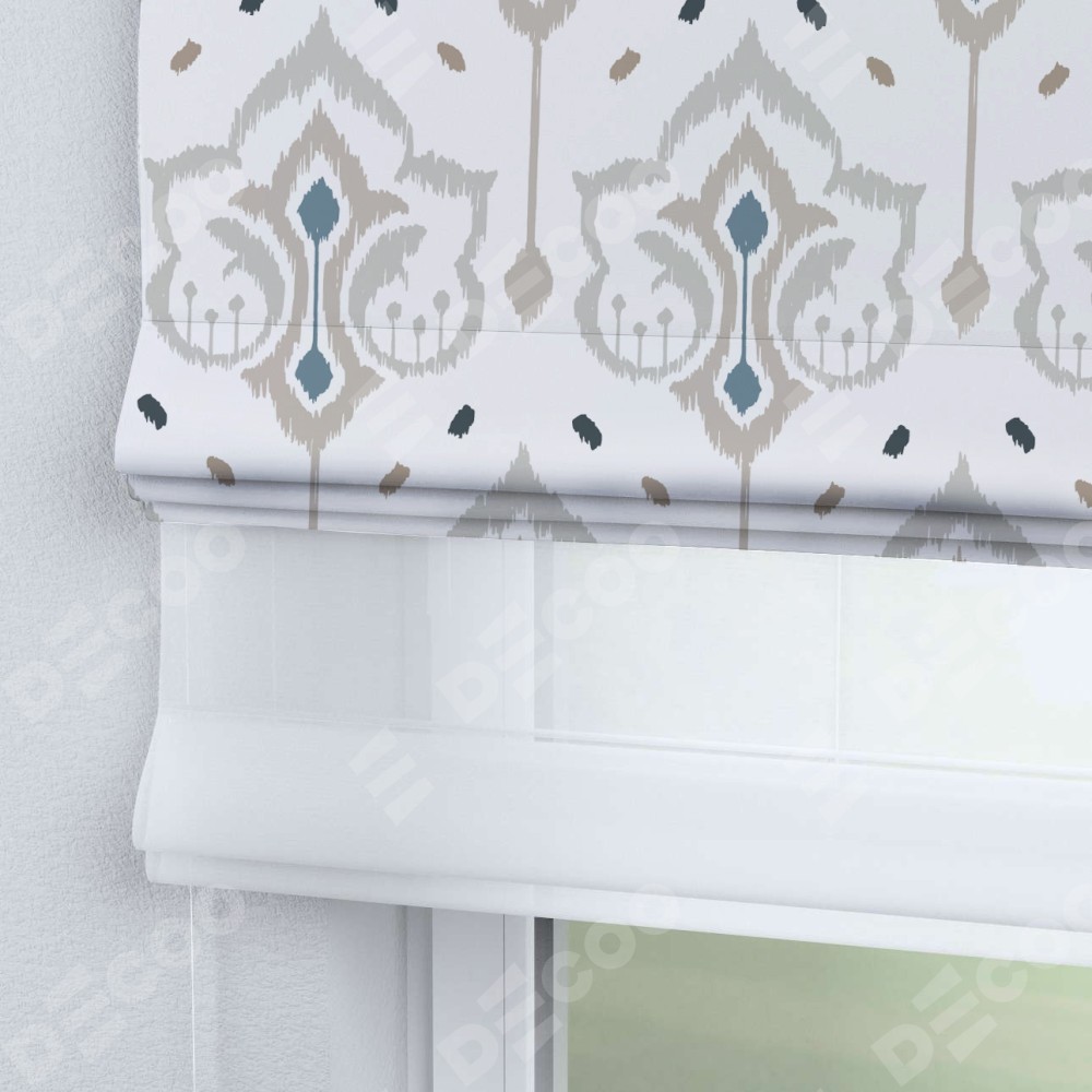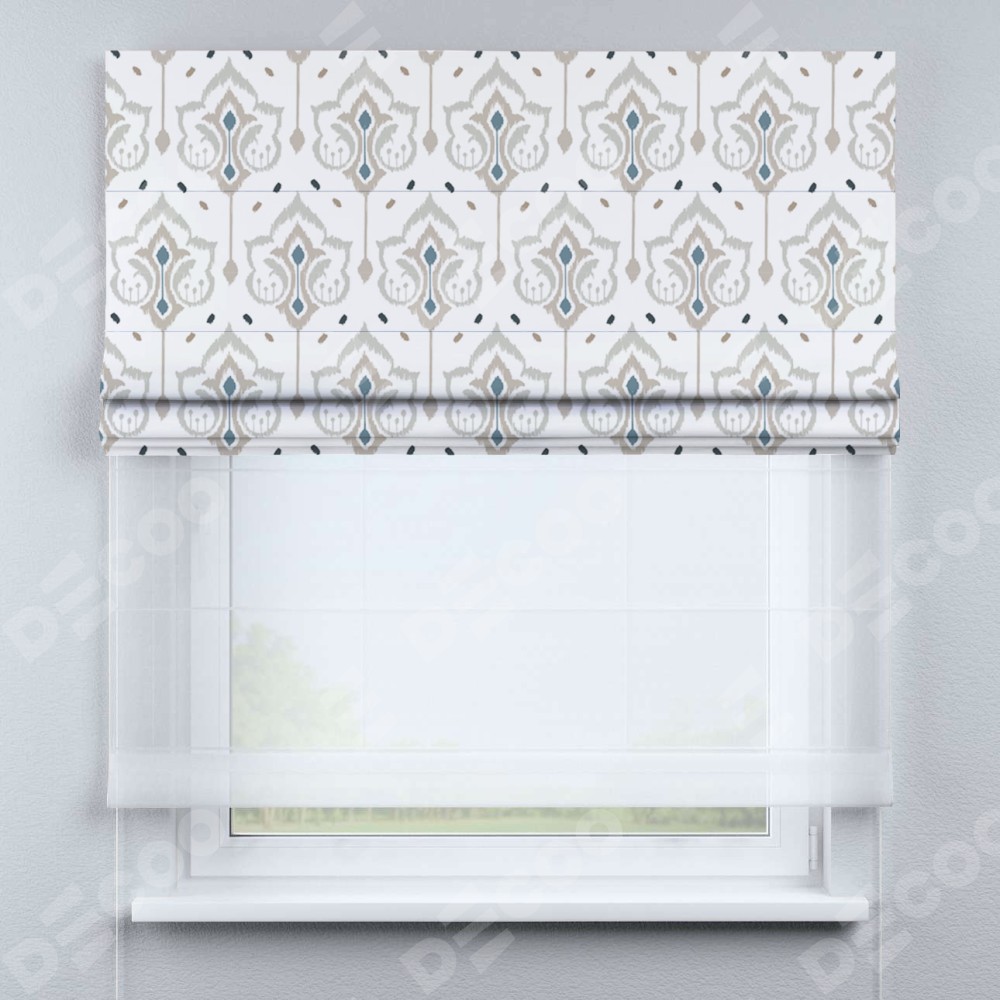 Римская штора день-ночь производителя «Cortin», используется для проёма, пошита из двух полотен, с лицевой блэкаут с нанесением сублимационной печати «Икат узор», вторая ткань тюль (по стандарту комплектуется тюль белого цвета артикул V-01). Имеет универсальный механизм и подходит для монтажа: на потолок, на стену и в нишу.
