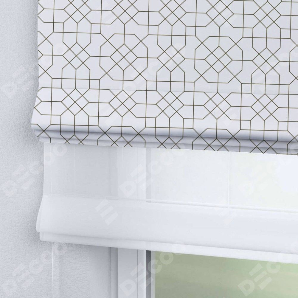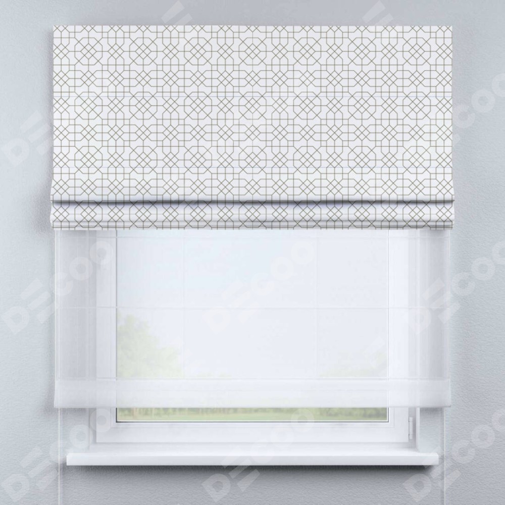 Римская штора день-ночь производителя «Cortin», используется для проёма, пошита из двух полотен, с лицевой блэкаут с нанесением сублимационной печати «Орнамент из тонких линий», вторая ткань тюль (по стандарту комплектуется тюль белого цвета артикул V-01). Имеет универсальный механизм и подходит для монтажа: на потолок, на стену и в нишу.