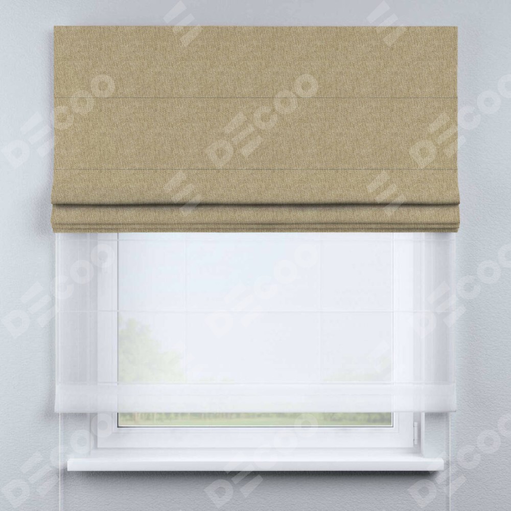 Римская штора день-ночь производителя «Cortin», используется для проёма, пошита из двух полотен, с лицевой стороны стиф димаут бежевый артикул 18083, вторая ткань тюль (по стандарту комплектуется тюль белого цвета артикул V-01). Имеет универсальный механизм и подходит для монтажа: на потолок, на стену и в нишу.