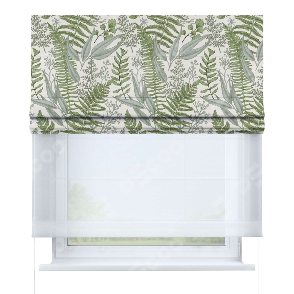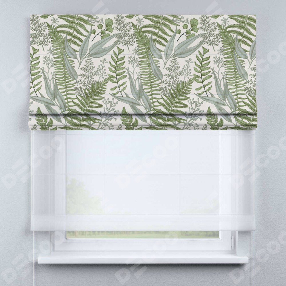 Римская штора день-ночь производителя «Cortin», используется для проёма, пошита из двух полотен, с лицевой блэкаут с нанесением сублимационной печати «Тенистый лес», вторая ткань тюль (по стандарту комплектуется тюль белого цвета артикул V-01). Имеет универсальный механизм и подходит для монтажа: на потолок, на стену и в нишу.