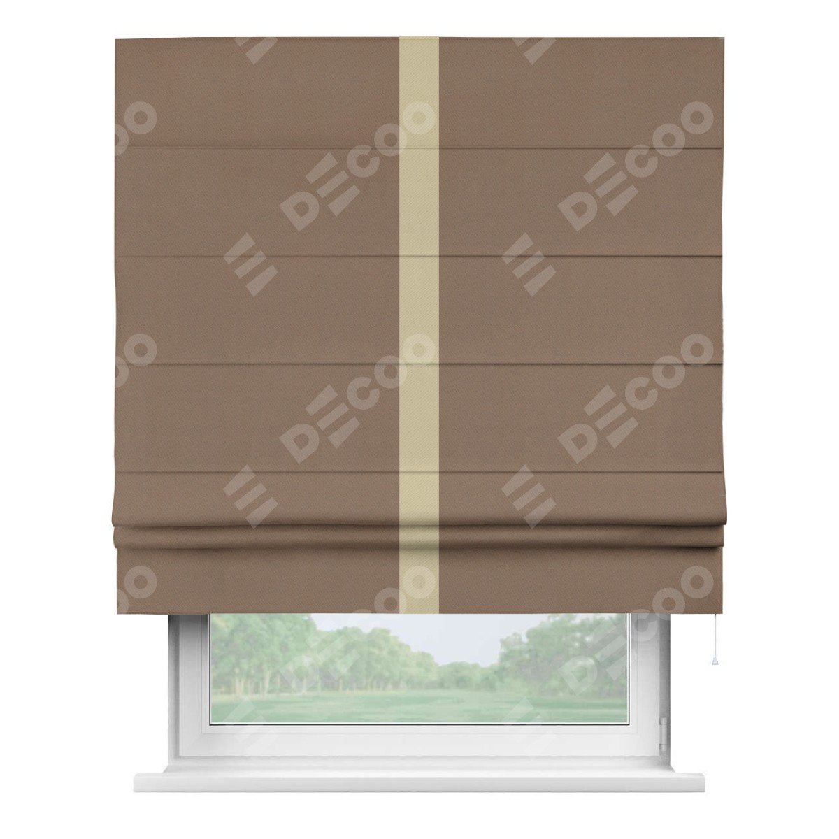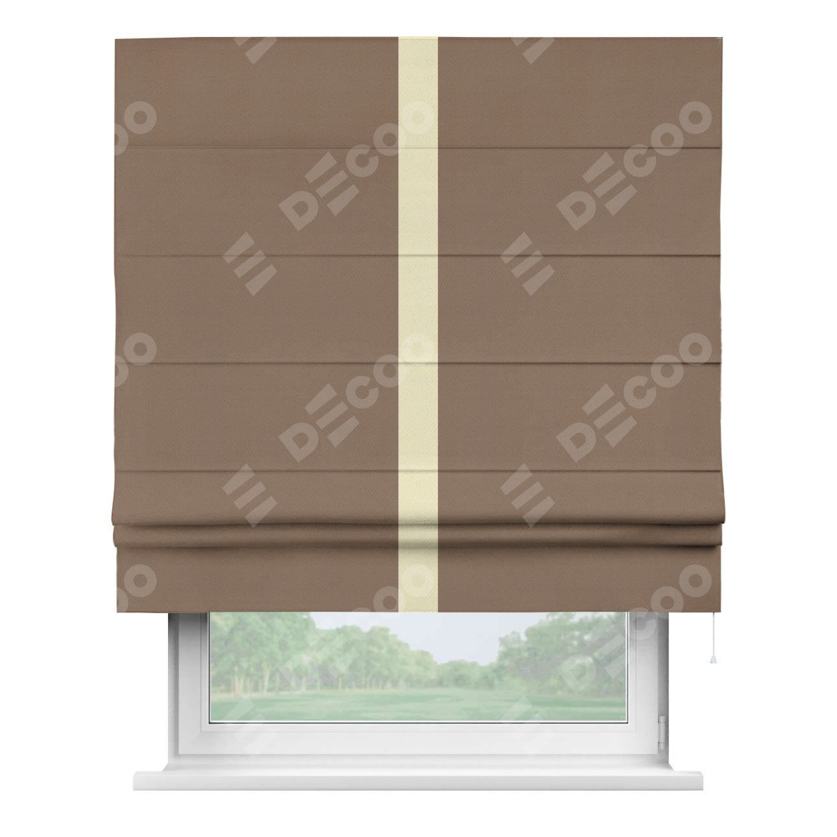 Римская штора производителя «Cortin», используется для проёма, пошита из ткани блэкаут однотонный коричневый, артикул ткани 88285. Отделка шторы кантом «Хайвей», ткань для канта используется из блэкаута однотонного разной расцветки на выбор. Имеет универсальный механизм и подходит для монтажа: на потолок, на стену и в нишу.