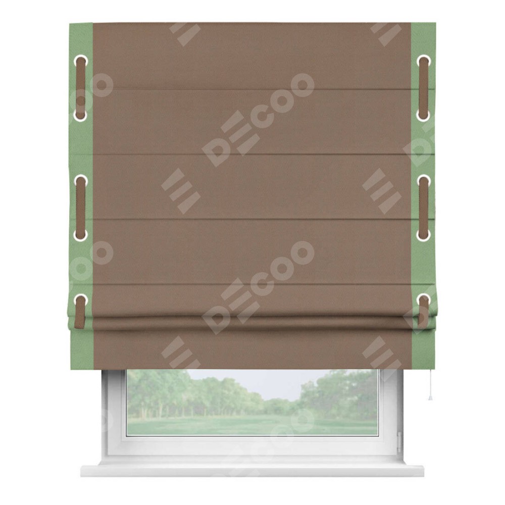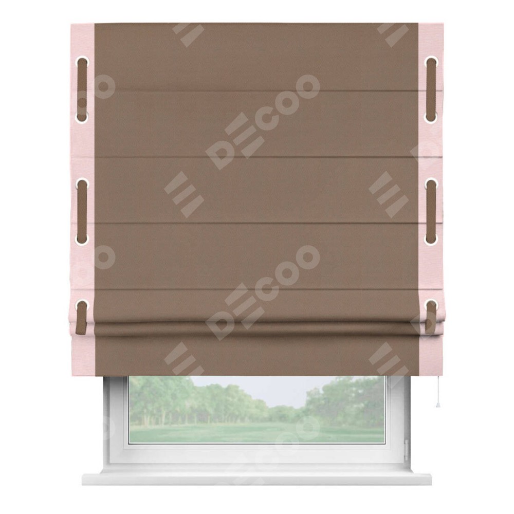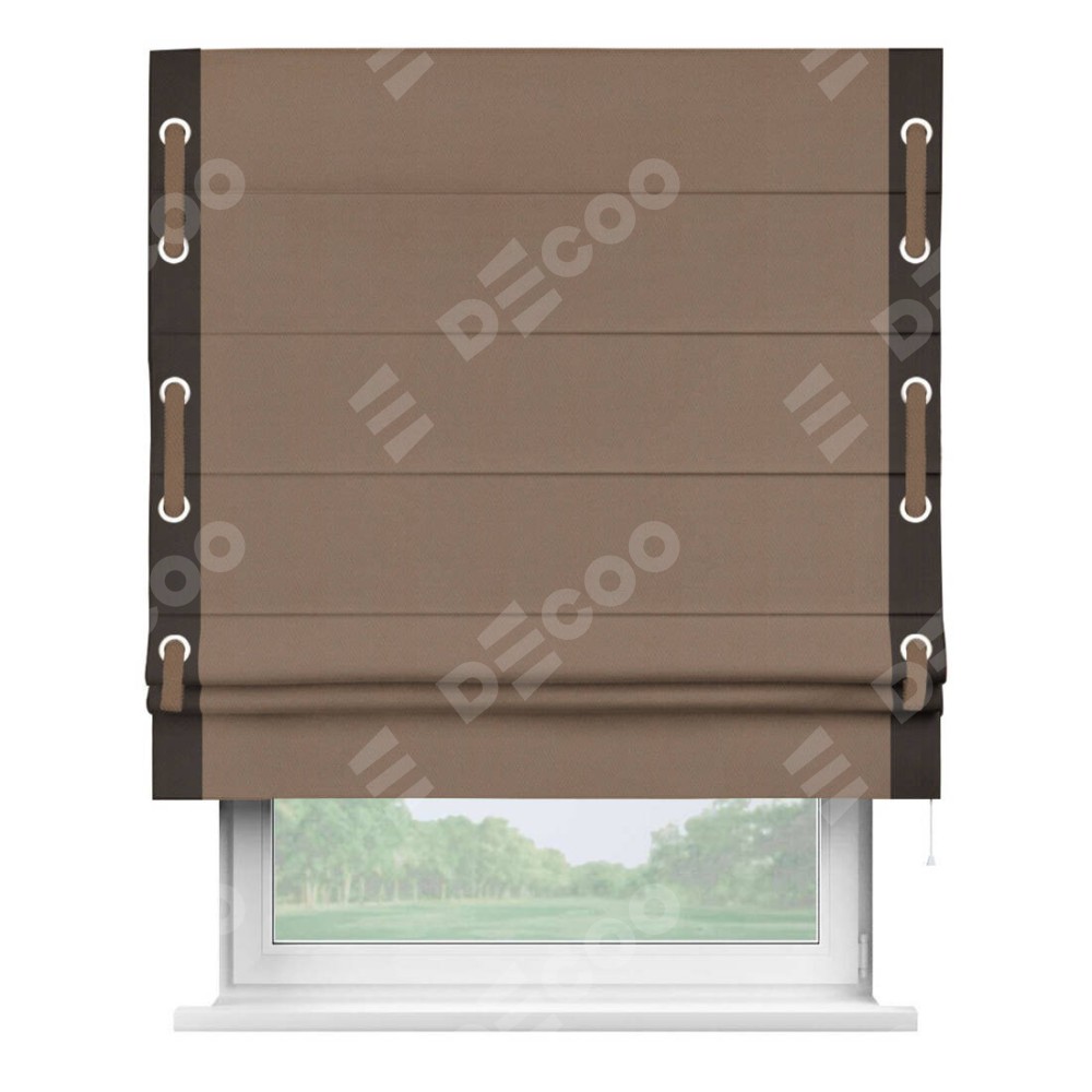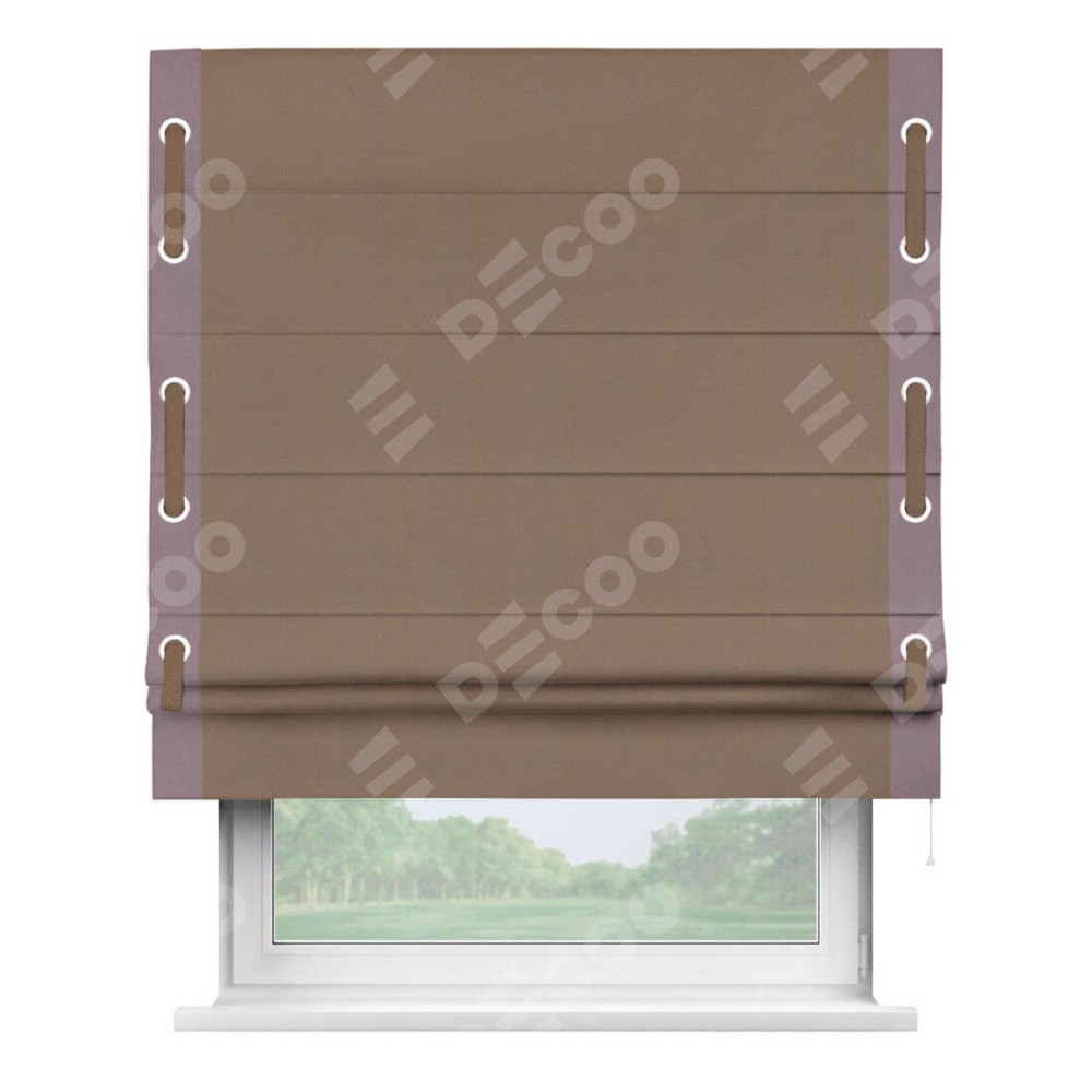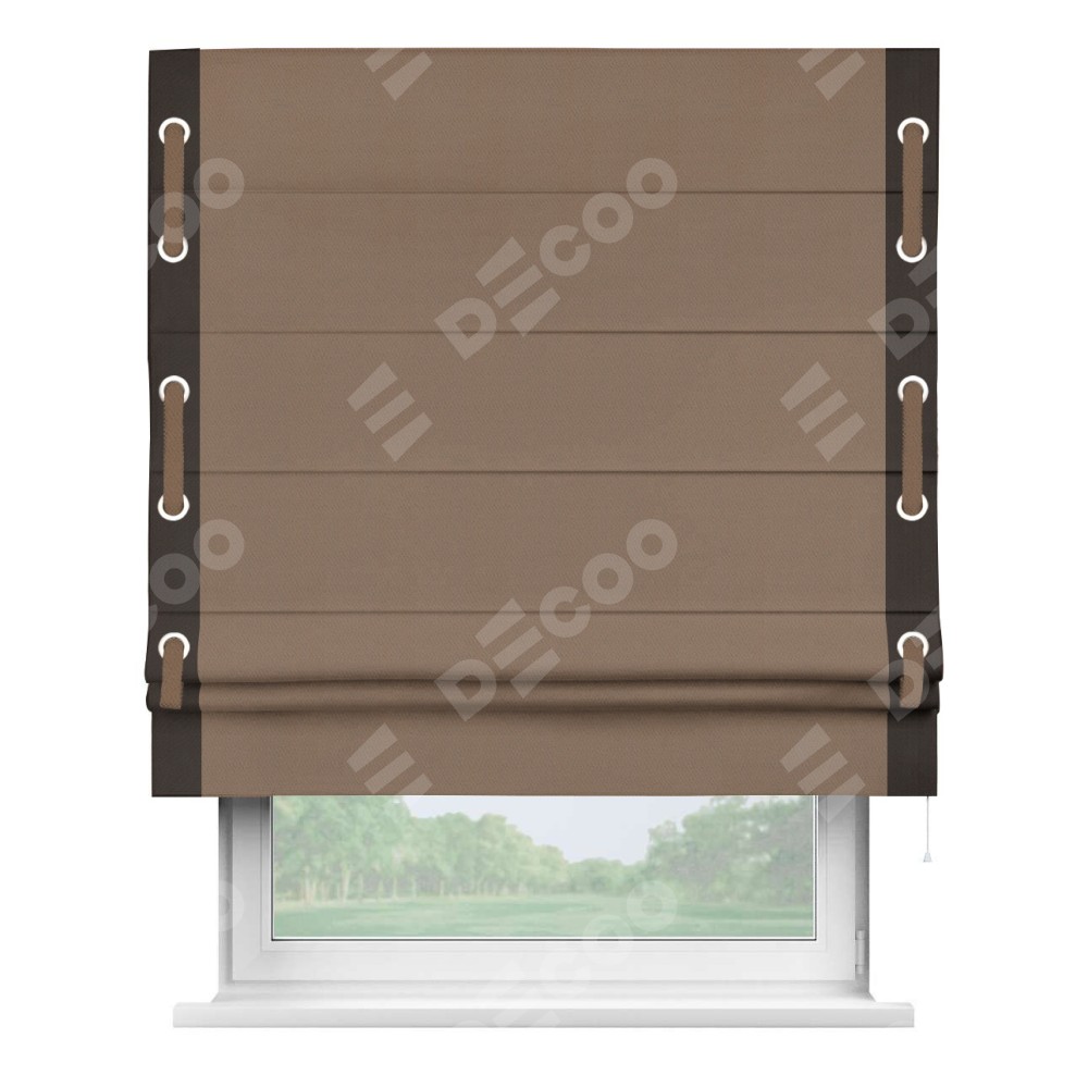Римская штора производителя «Cortin», используется для проёма, пошита из ткани блэкаут однотонный коричневый, артикул ткани 88285. Отделка шторы кантом «Стрим Дуо» на кантах расположены люверсы с пояском, ткань для канта используется из блэкаута однотонного разной расцветки на выбор. Ткань для пояска обычно используется из основной ткани шторы, а так же можно сделать из любой расцветки по желанию. Имеет универсальный механизм и подходит для монтажа: на потолок, на стену и в нишу.