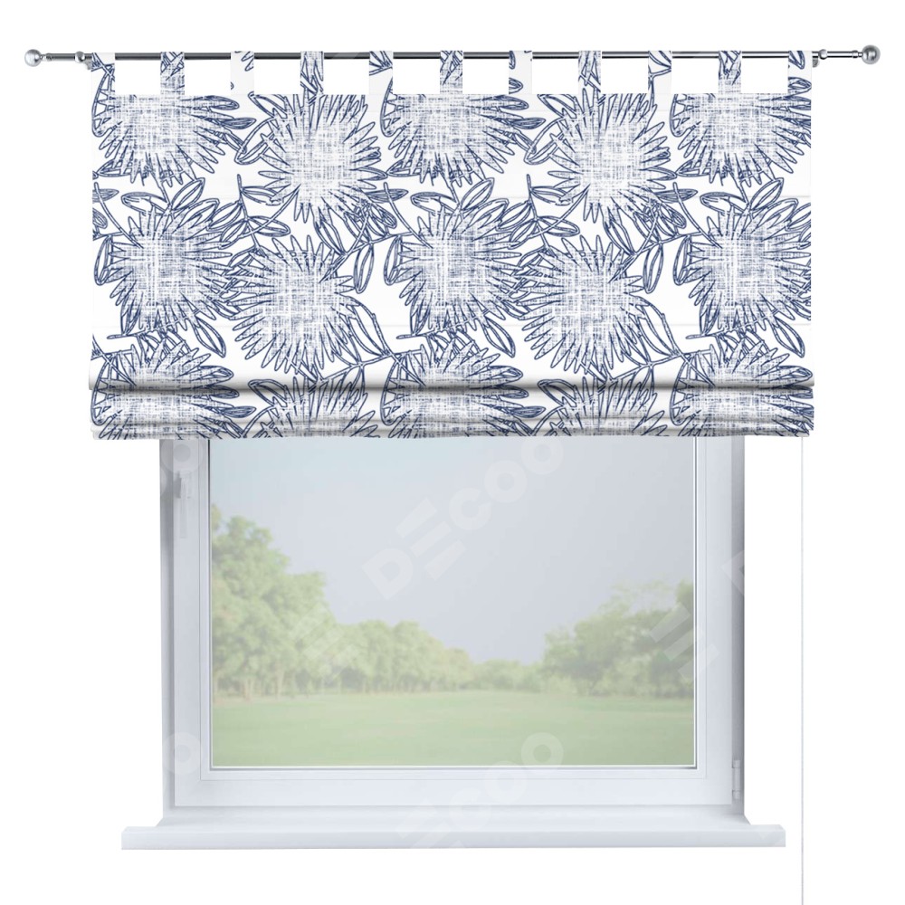 Римская штора производителя «Cortin», используется для проёма, пошита из ткани блэкаут с нанесением сублимационной печати «Синий букет». Данная модель пошита на петлях, комплектуется на выбор круглым карнизом и подходит для монтажа на стену. Римская штора на петлях имеет простую систему регулировки высоты, отличительным преимуществом данной модели является простой способ монтажа. Достаточно повесить ее на трубу и штора готова!