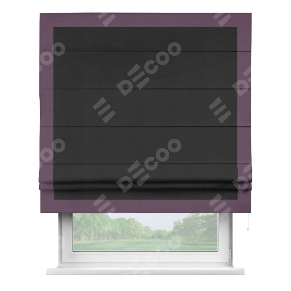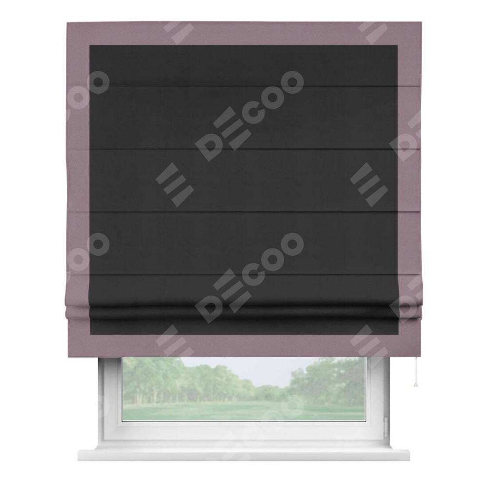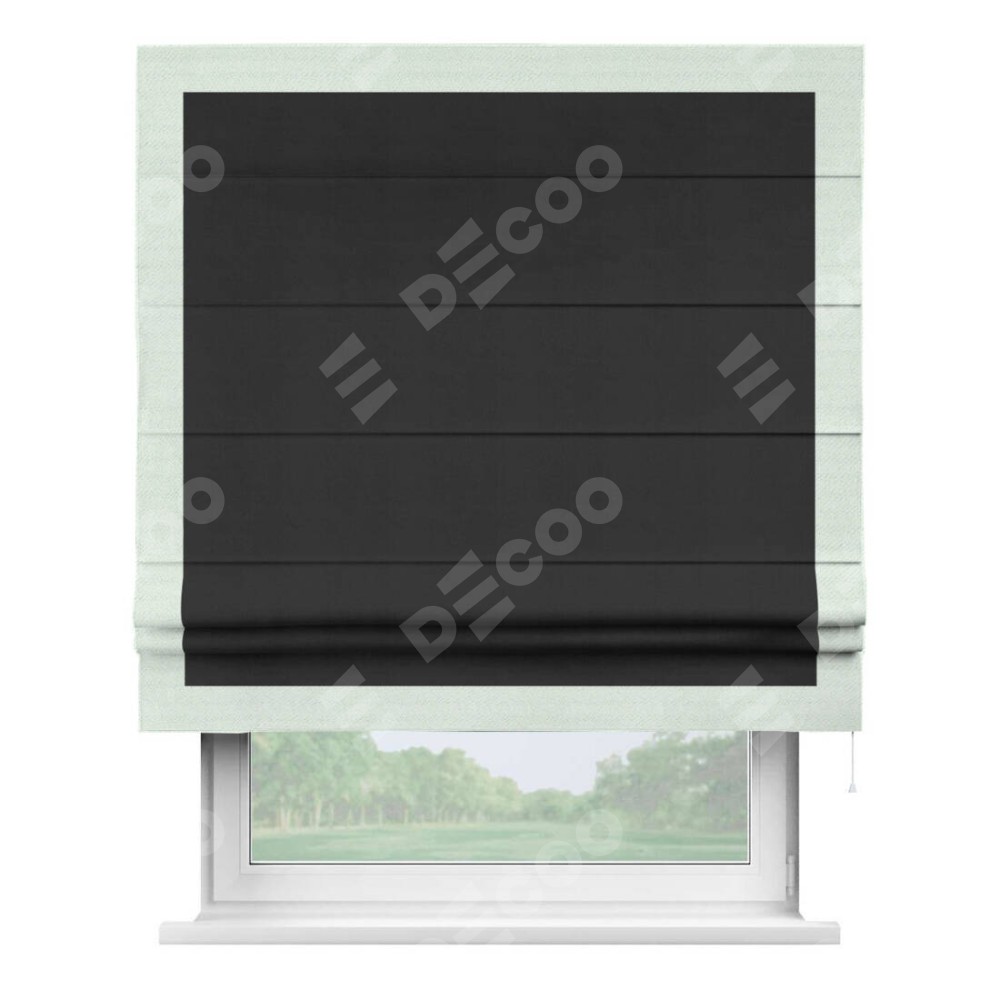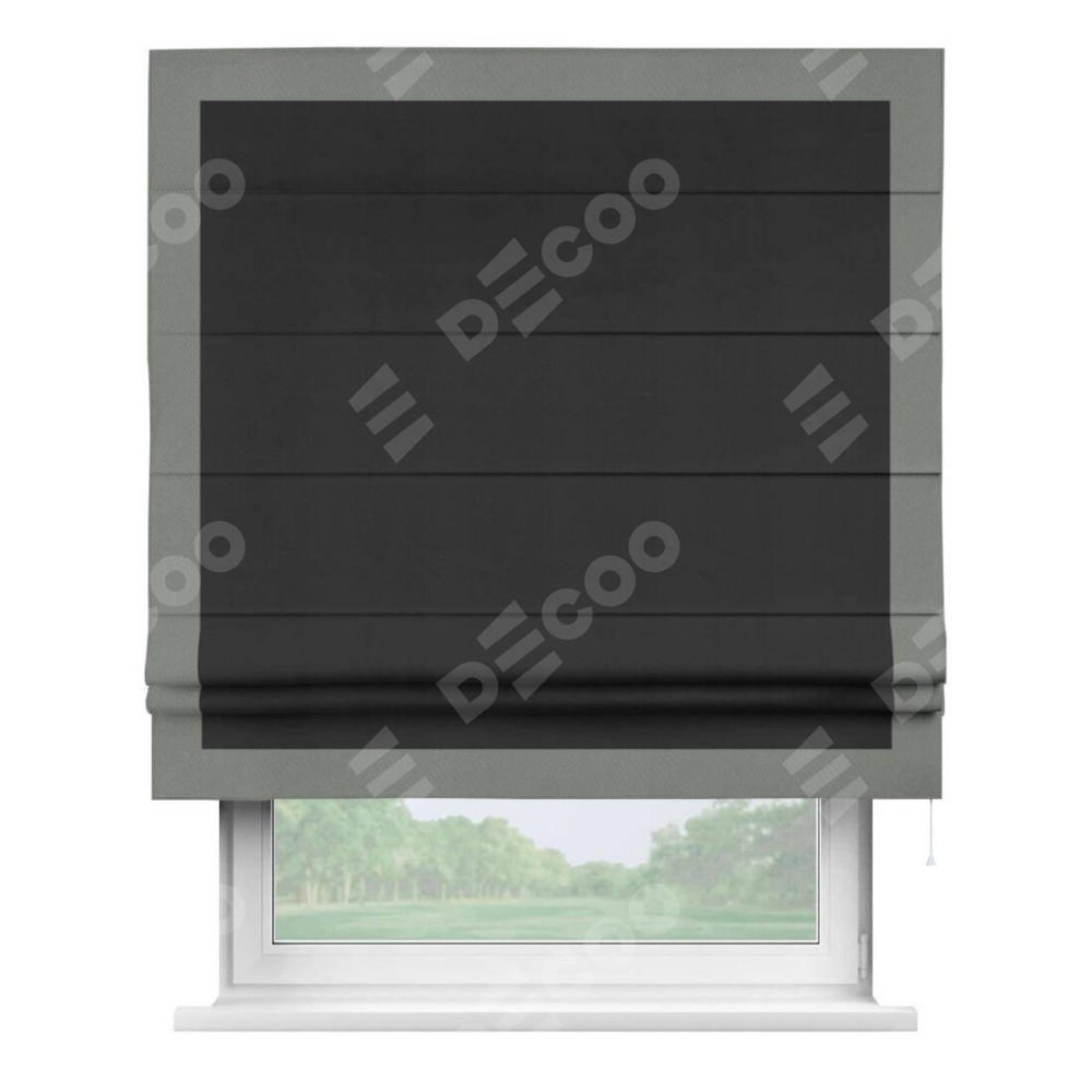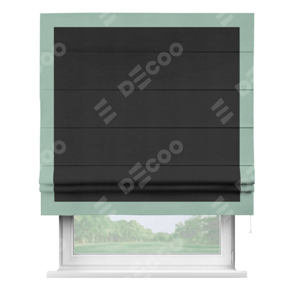 Римская штора производителя «Cortin», используется для проёма, пошита из ткани блэкаут однотонный черный, артикул ткани 79904. Отделка шторы кантом «Чесс», ткань для канта используется из блэкаута однотонного разной расцветки на выбор. Имеет универсальный механизм и подходит для монтажа: на потолок, на стену и в нишу.