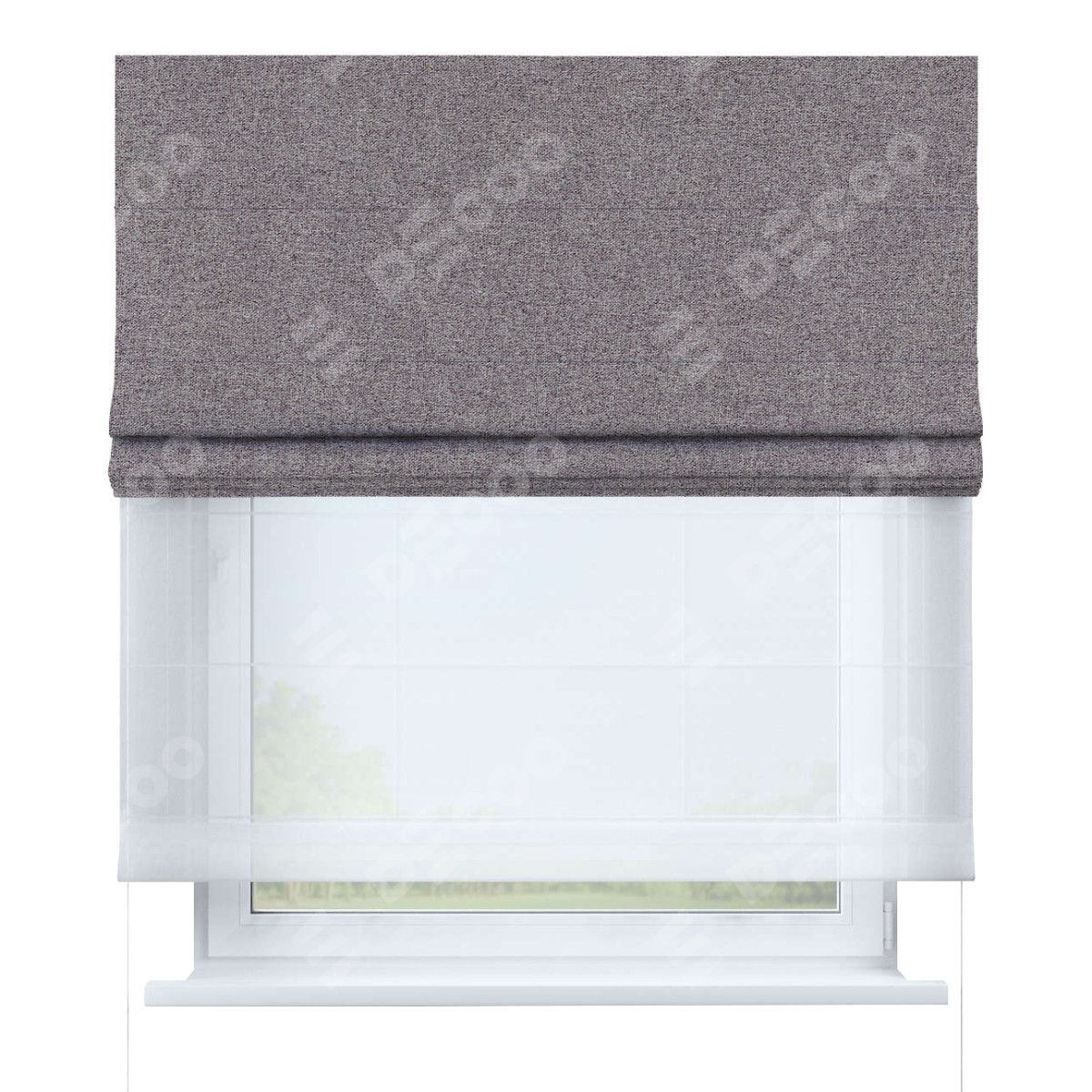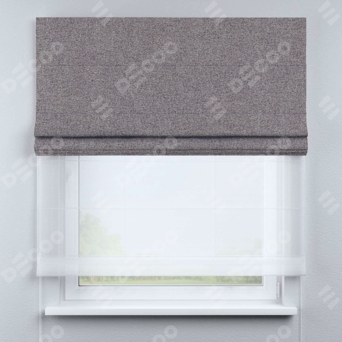 Римская штора день-ночь производителя «Cortin», используется для проёма, пошита из двух полотен, с лицевой стороны лён блэкаут сиреневый артикул 69576, вторая ткань тюль (по стандарту комплектуется тюль белого цвета артикул V-01). Имеет универсальный механизм и подходит для монтажа: на потолок, на стену и в нишу.