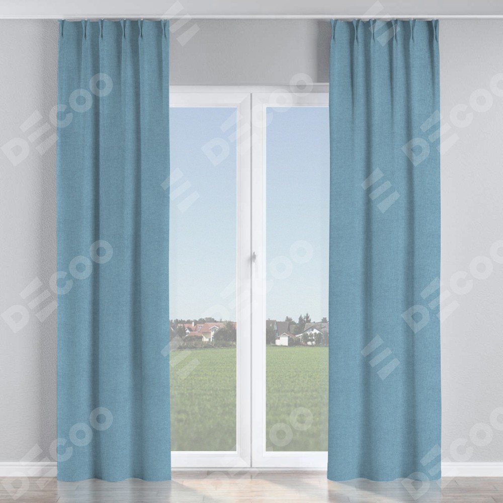 Комплект прямых штор, от производителя «Cortin», пошиты из ткани лён блэкаут голубой, артикул ткани 69574. С изнаночной стороны в верхней части штор пристрачивается шторная лента с декоративными складками «Кустик». Для создания элегантных складок прямые шторы шьются по стандарту с коэффициентом 1:2 (на 100 см. ширины проёма 200 см. ширины ткани).