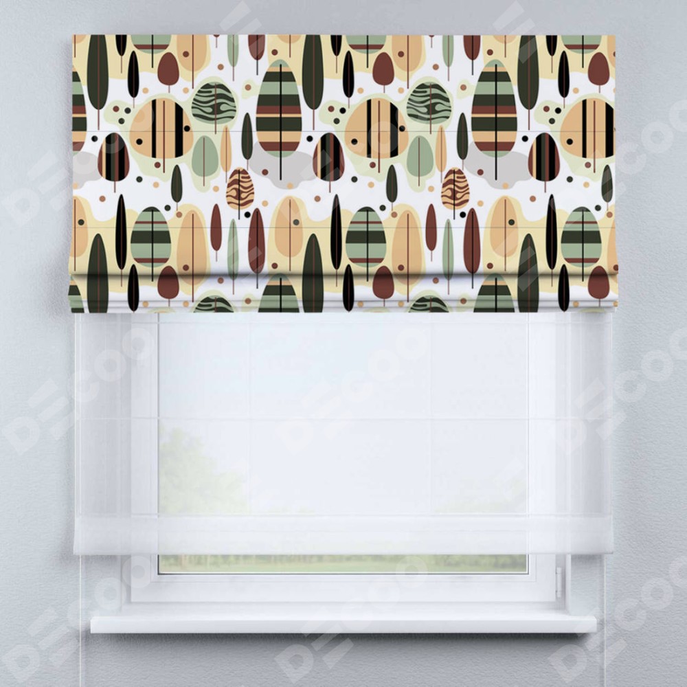 Римская штора день-ночь производителя «Cortin», используется для проёма, пошита из двух полотен, с лицевой блэкаут с нанесением сублимационной печати «Деревья в полоску», вторая ткань тюль (по стандарту комплектуется тюль белого цвета артикул V-01). Имеет универсальный механизм и подходит для монтажа: на потолок, на стену и в нишу.