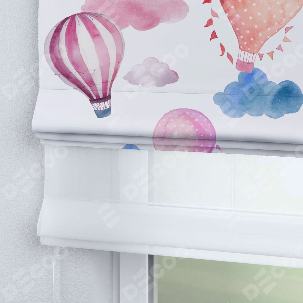 Римская штора день-ночь производителя «Cortin», используется для проёма, пошита из двух полотен, с лицевой блэкаут с нанесением сублимационной печати «Полёт в облаках», вторая ткань тюль (по стандарту комплектуется тюль белого цвета артикул V-01). Имеет универсальный механизм и подходит для монтажа: на потолок, на стену и в нишу.