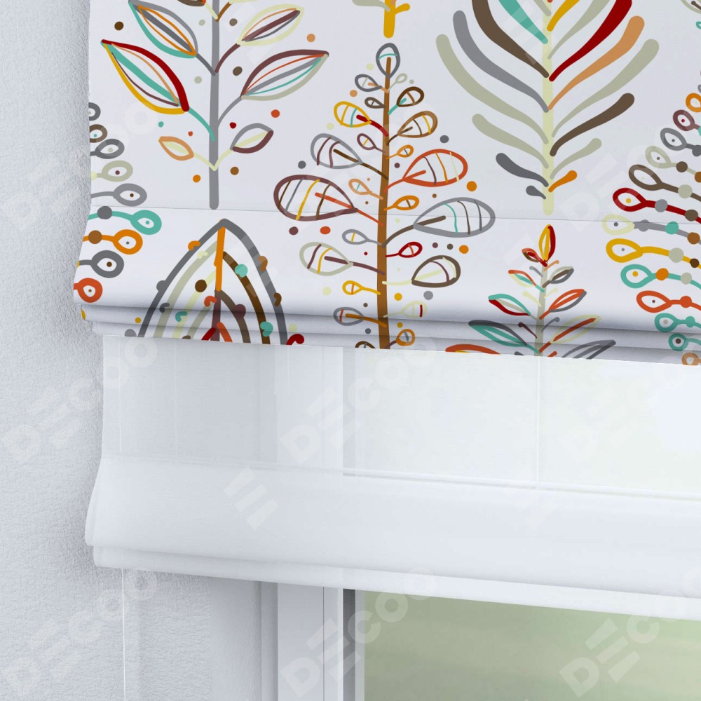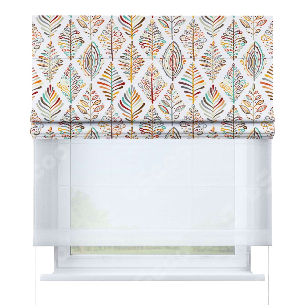 Римская штора день-ночь производителя «Cortin», используется для проёма, пошита из двух полотен, с лицевой блэкаут с нанесением сублимационной печати «Растительные ромбы», вторая ткань тюль (по стандарту комплектуется тюль белого цвета артикул V-01). Имеет универсальный механизм и подходит для монтажа: на потолок, на стену и в нишу.