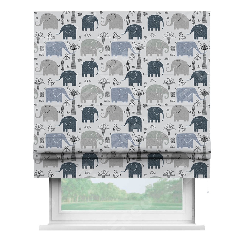 Римская штора производителя «Cortin», используется для проёма, пошита из ткани блэкаут с нанесением сублимационной печати «Серые слоники». Имеет универсальный механизм и подходит для монтажа: на потолок, на стену и в нишу.