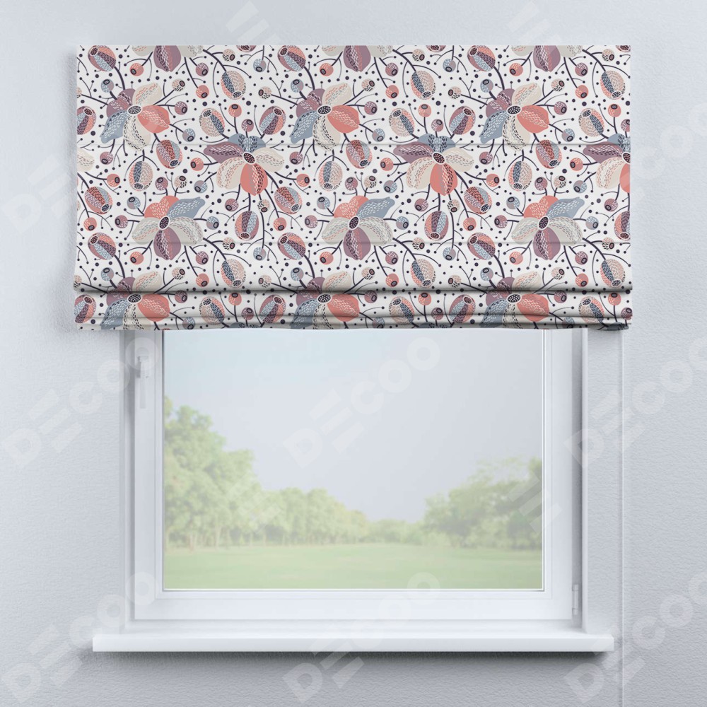 Римская штора производителя «Cortin», используется для проёма, пошита из ткани блэкаут с нанесением сублимационной печати «Цветочный микс». Имеет универсальный механизм и подходит для монтажа: на потолок, на стену и в нишу.