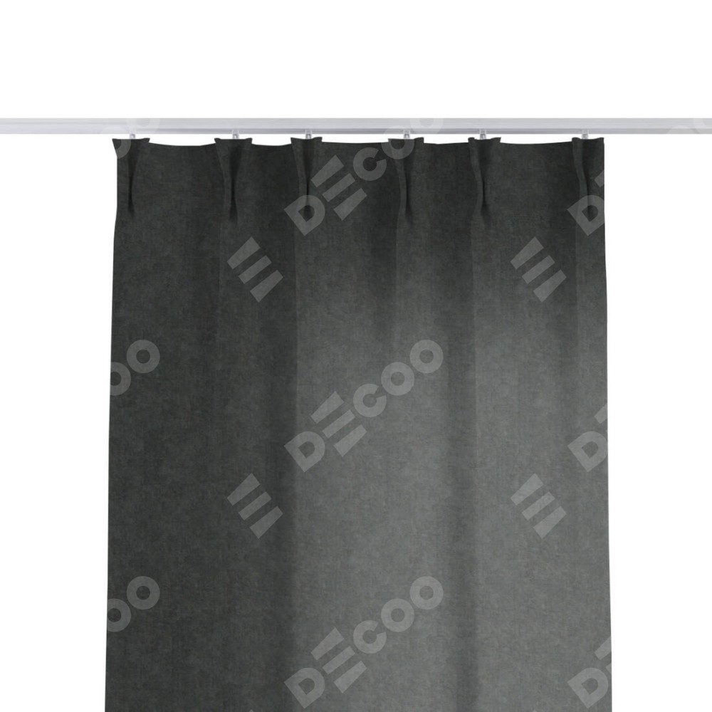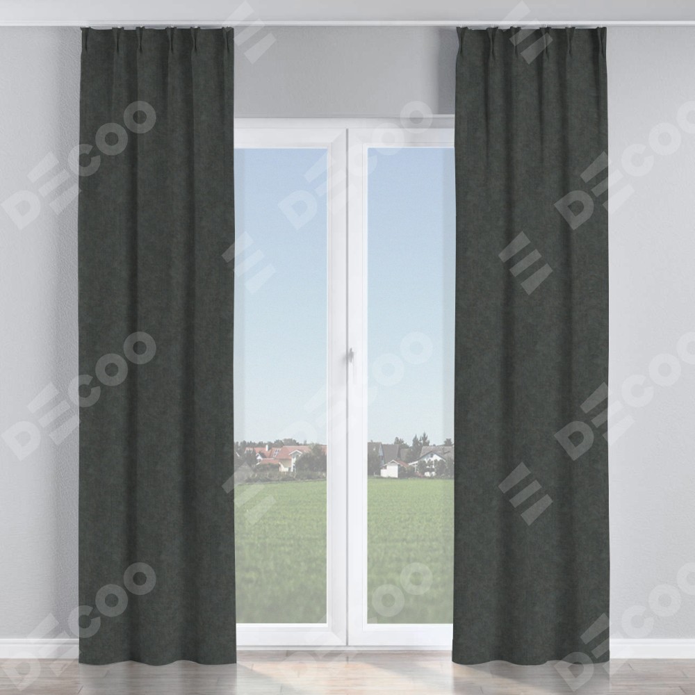 Комплект прямых штор, от производителя «Cortin», пошиты из ткани вельвет тёмно-серый, артикул ткани 33811. С изнаночной стороны в верхней части штор пристрачивается шторная лента с декоративными складками «Кустик». Для создания элегантных складок прямые шторы шьются по стандарту с коэффициентом 1:2 (на 100 см. ширины проёма 200 см. ширины ткани).