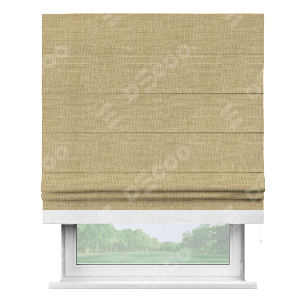 Римская штора производителя «Cortin», используется для проёма, пошита из ткани лён бежевый, артикул 7442. Отделка шторы кантом «Джестер», ткань для канта используется из льна разной расцветки на выбор. Имеет универсальный механизм и подходит для монтажа: на потолок, на стену и в нишу.