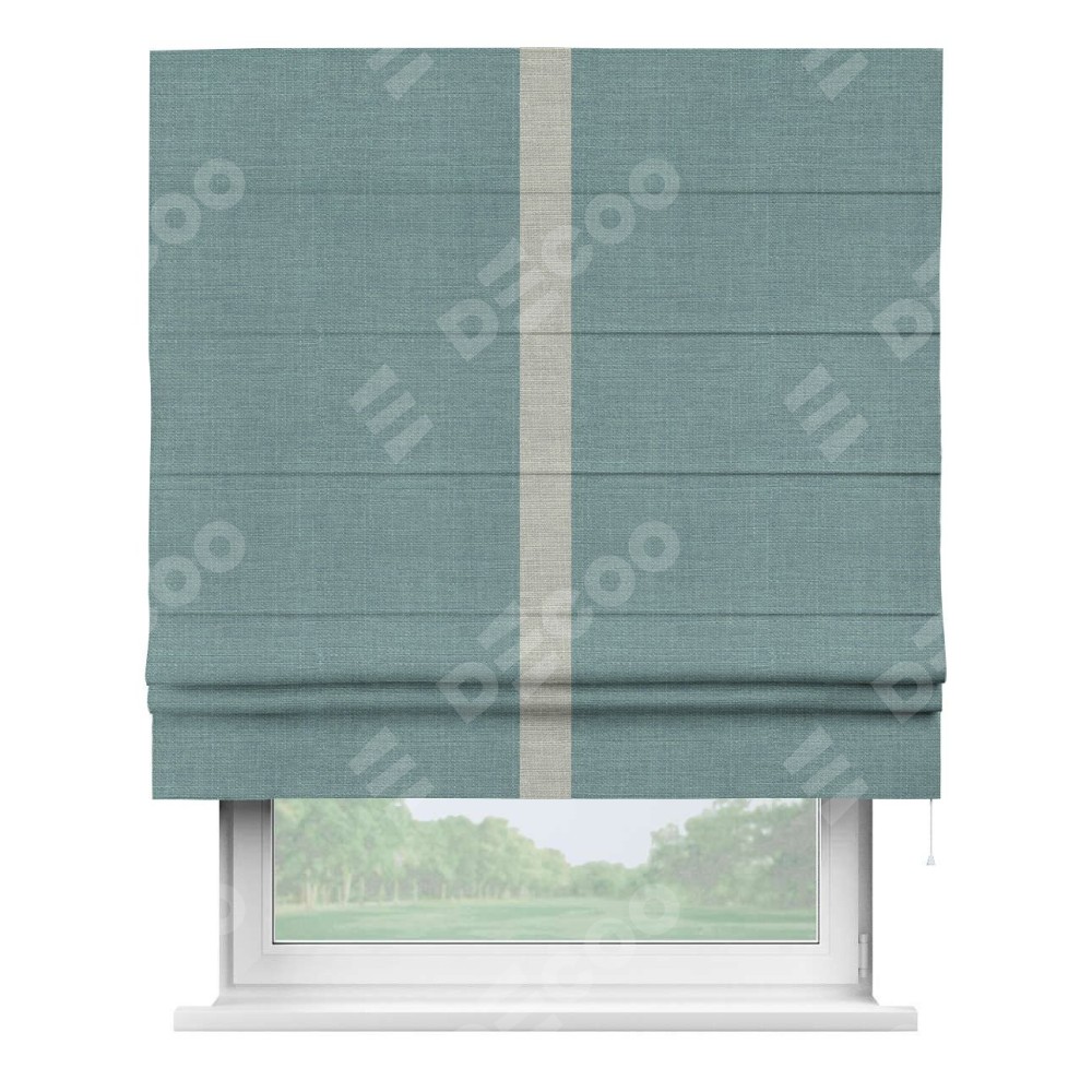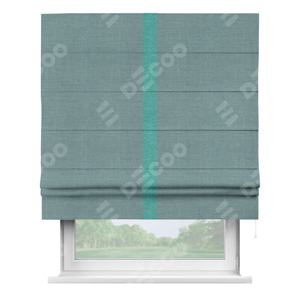 Римская штора производителя «Cortin», используется для проёма, пошита из ткани лён голубой, артикул 74736. Отделка шторы кантом «Хайвэй», ткань для канта используется из льна разной расцветки на выбор. Имеет универсальный механизм и подходит для монтажа: на потолок, на стену и в нишу.