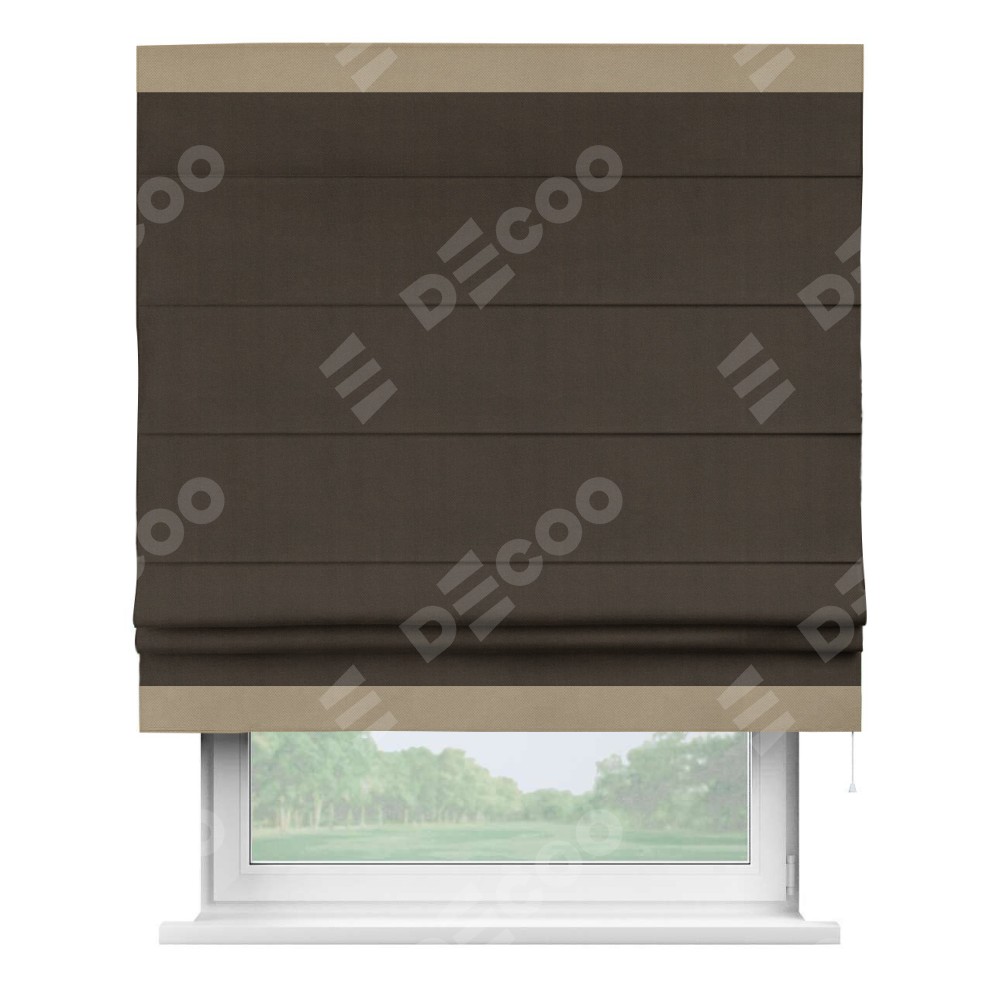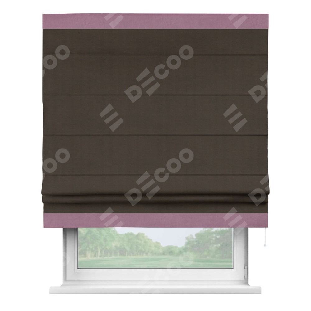 Римская штора производителя «Cortin», используется для проёма, пошита из ткани вельвет тёмно-коричневый, артикул ткани 30991. Отделка шторы кантом «Горизонт», ткань для канта используется из вельвета разной расцветки на выбор. Имеет универсальный механизм и подходит для монтажа: на потолок, на стену и в нишу.