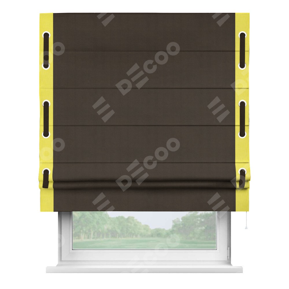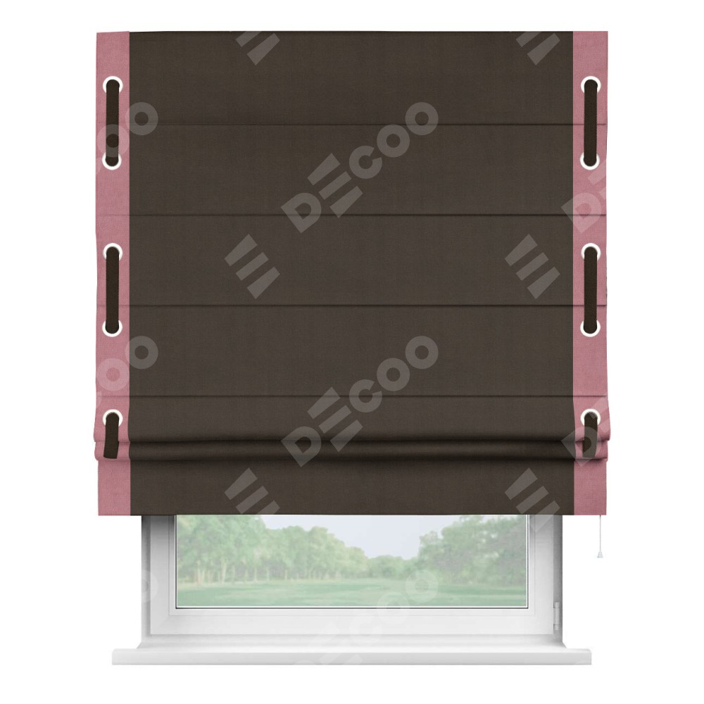 Римская штора производителя «Cortin», используется для проёма, пошита из ткани вельвет тёмно-коричневый, артикул ткани 30991. Отделка шторы кантом «Стрим Дуо» на кантах расположены люверсы с пояском, ткань для канта используется из вельвета разной расцветки на выбор. Ткань для пояска обычно используется из основной ткани шторы, а так же можно сделать из любой расцветки по желанию. Имеет универсальный механизм и подходит для монтажа: на потолок, на стену и в нишу.