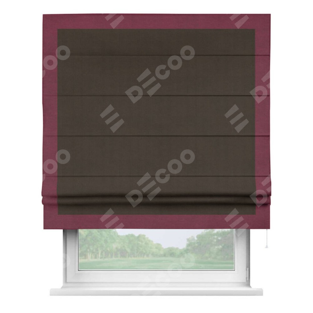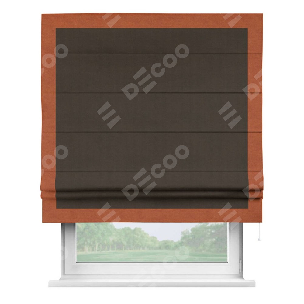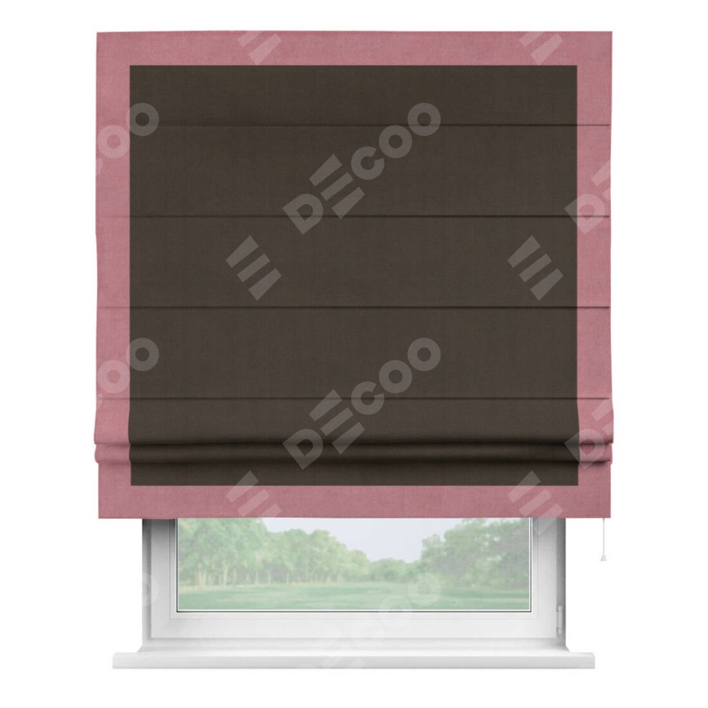 Римская штора производителя «Cortin», используется для проёма, пошита из ткани вельвет тёмно-коричневый, артикул ткани 30991. Отделка шторы кантом «Чесс», ткань для канта используется из вельвета разной расцветки на выбор. Имеет универсальный механизм и подходит для монтажа: на потолок, на стену и в нишу.