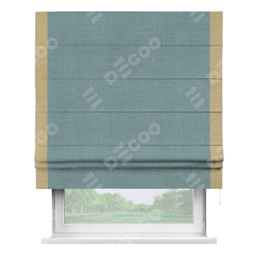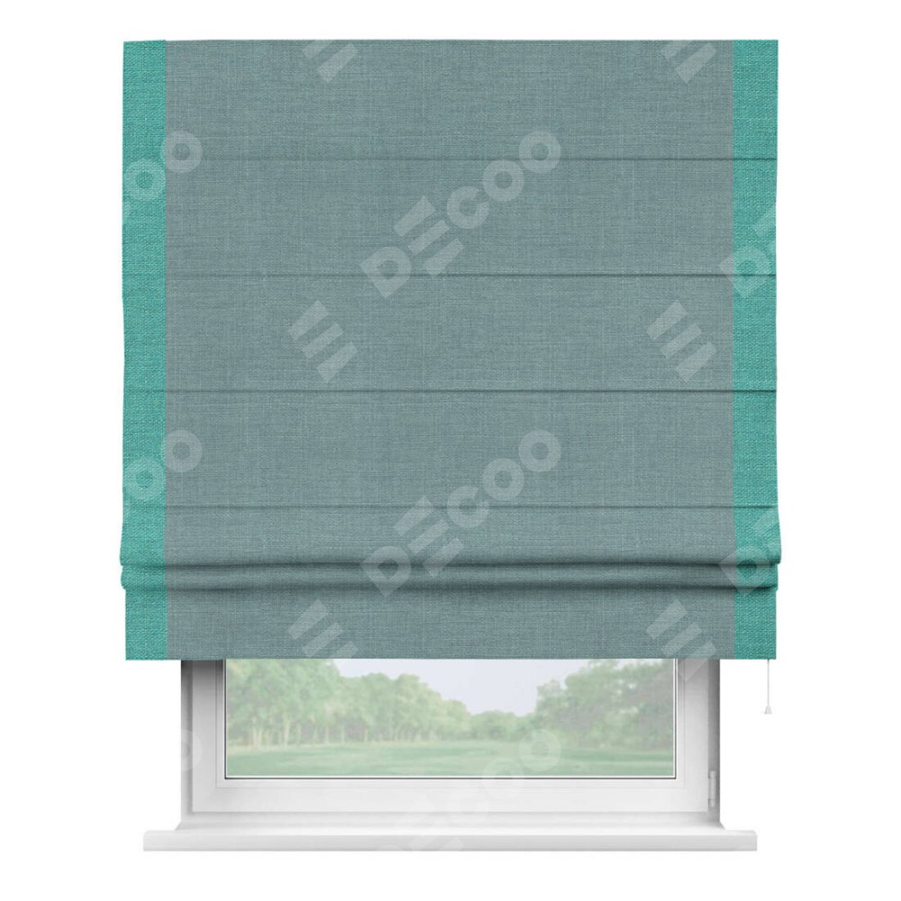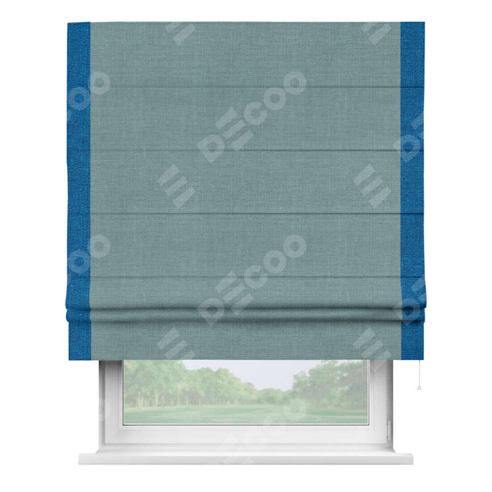 Римская штора производителя «Cortin», используется для проёма, пошита из ткани лён голубой, артикул 74736. Отделка шторы кантом «Стрим Дуо», ткань для канта используется из льна разной расцветки на выбор. Имеет универсальный механизм и подходит для монтажа: на потолок, на стену и в нишу.