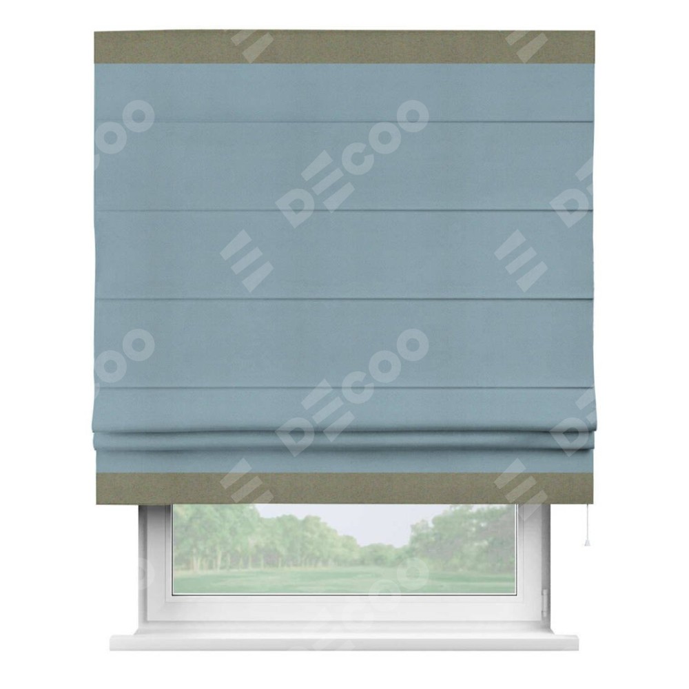 Римская штора производителя «Cortin», используется для проёма, пошита из ткани блэкаут однотонный серо-голубой, артикул ткани 29327−2. Отделка шторы кантом «Горизонт», ткань для канта используется из блэкаута однотонного разной расцветки на выбор. Имеет универсальный механизм и подходит для монтажа: на потолок, на стену и в нишу.