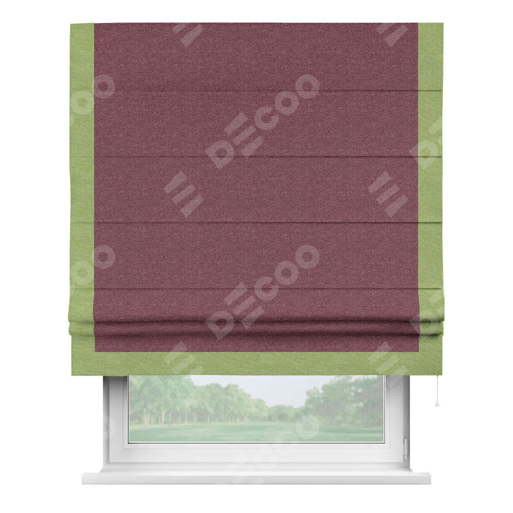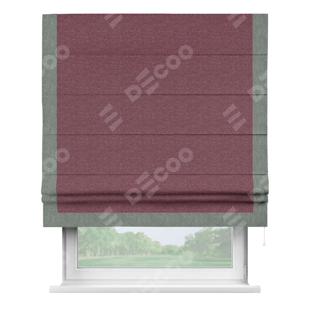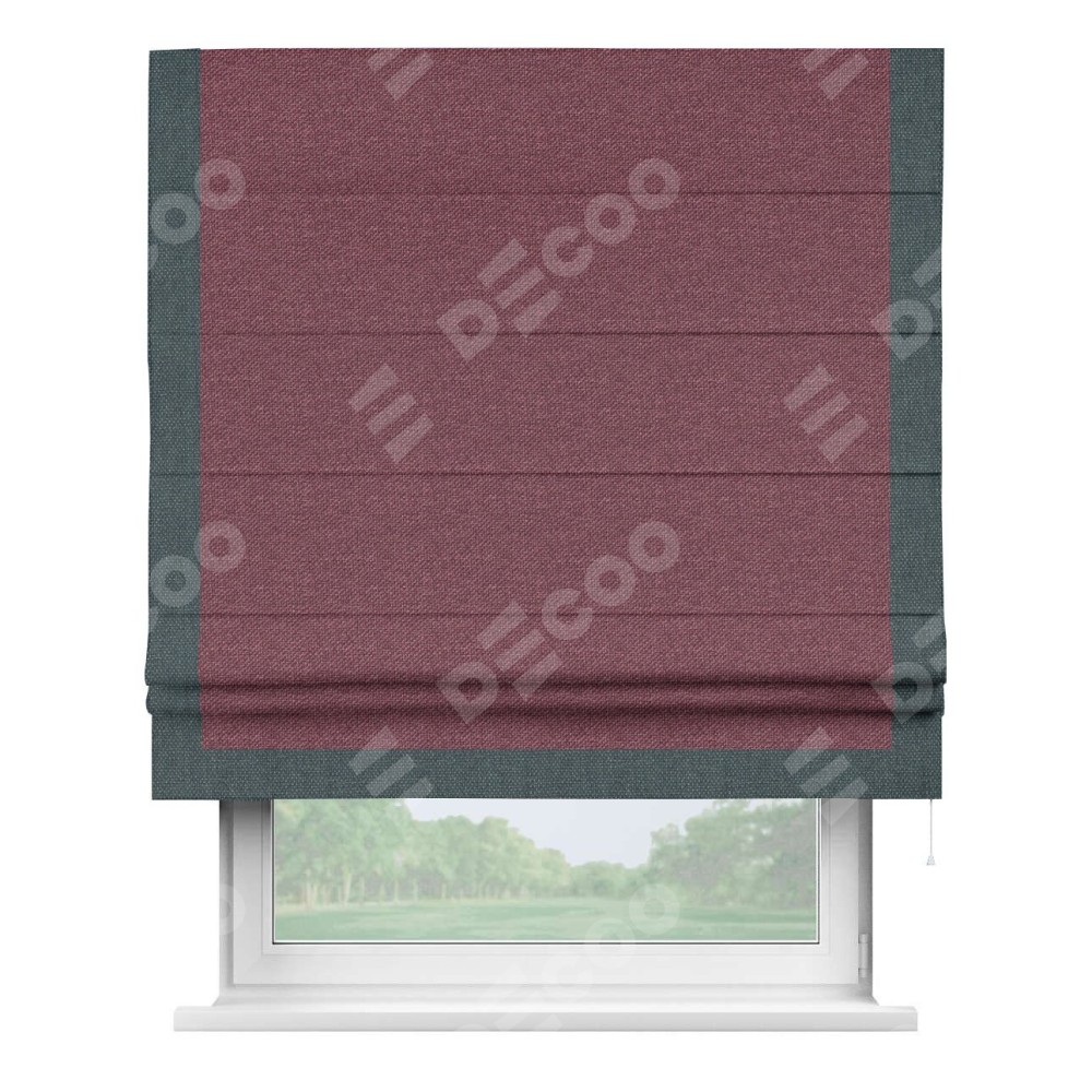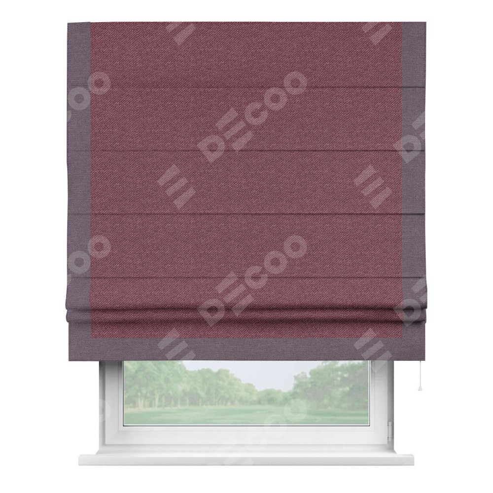Римская штора производителя «Cortin», используется для проёма, пошита из ткани лён димаут марсала, артикул 1602. Отделка шторы кантом «Виктория», ткань для канта используется из льна димаут разной расцветки на выбор. Имеет универсальный механизм и подходит для монтажа: на потолок, на стену и в нишу.