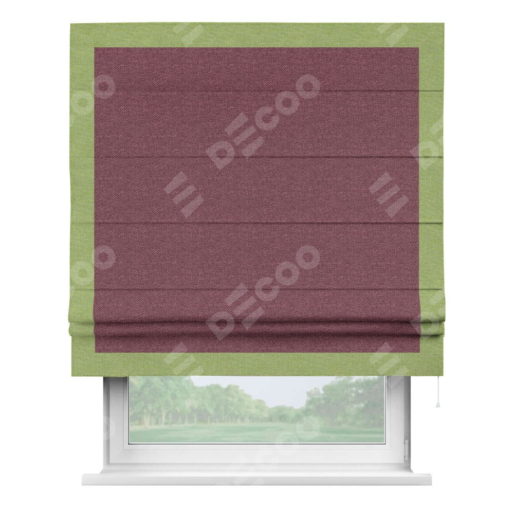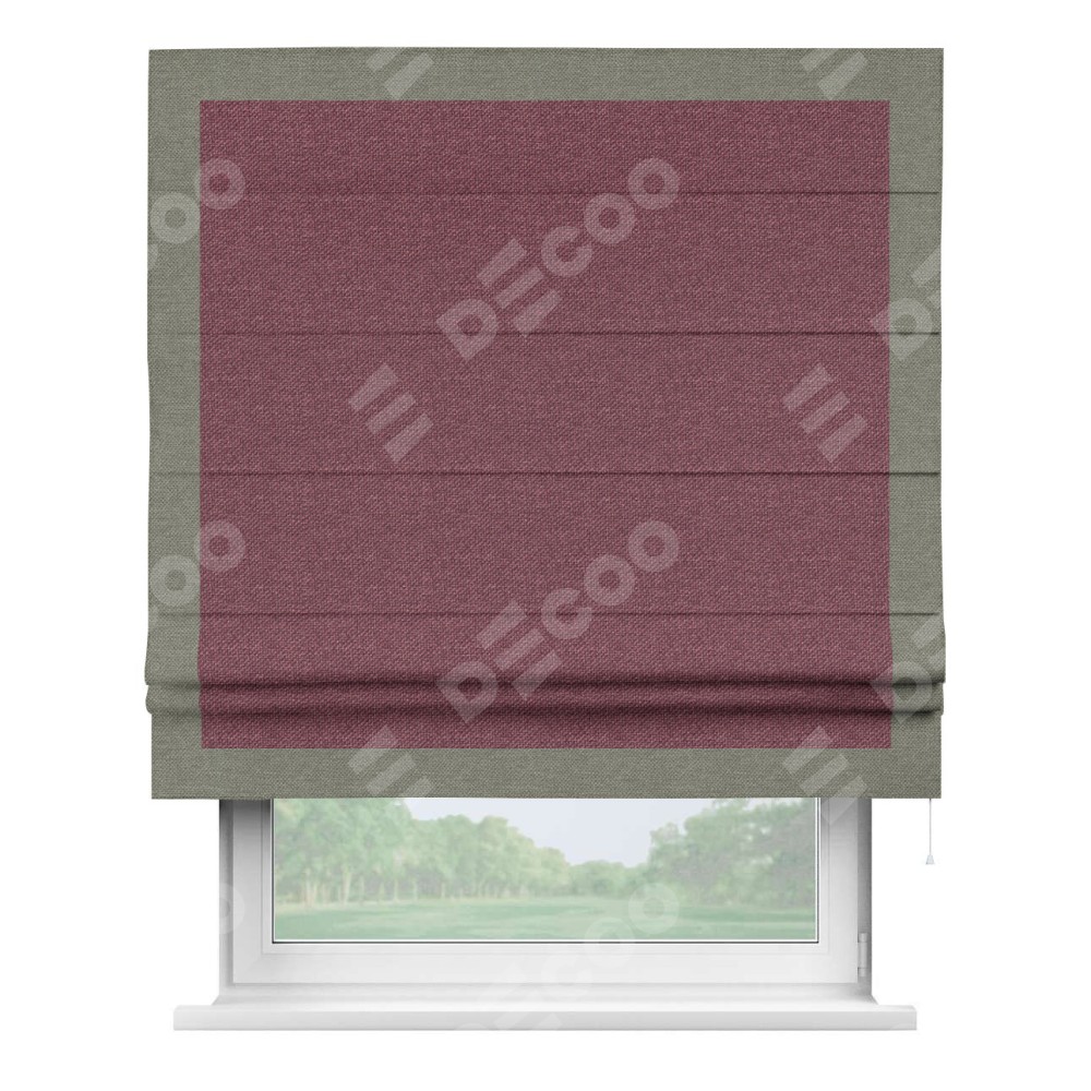 Римская штора производителя «Cortin», используется для проёма, пошита из ткани лён димаут марсала, артикул 1602. Отделка шторы кантом «Чесс», ткань для канта используется из льна димаут разной расцветки на выбор. Имеет универсальный механизм и подходит для монтажа: на потолок, на стену и в нишу.