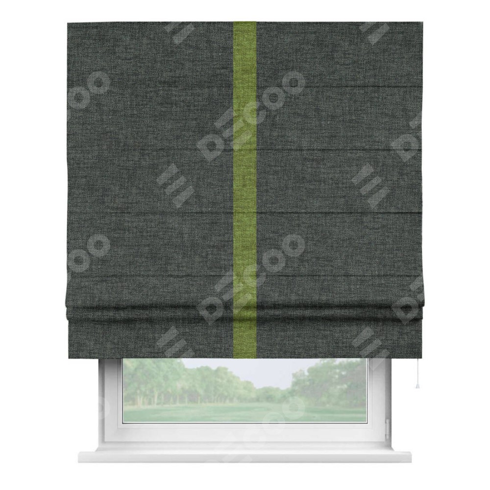 Римская штора производителя «Cortin», используется для проёма, пошита из ткани рогожка димаут графит, артикул 102−34. Отделка шторы кантом «Хайвэй», ткань для канта используется из рогожки димаут разной расцветки на выбор. Имеет универсальный механизм и подходит для монтажа: на потолок, на стену и в нишу.
