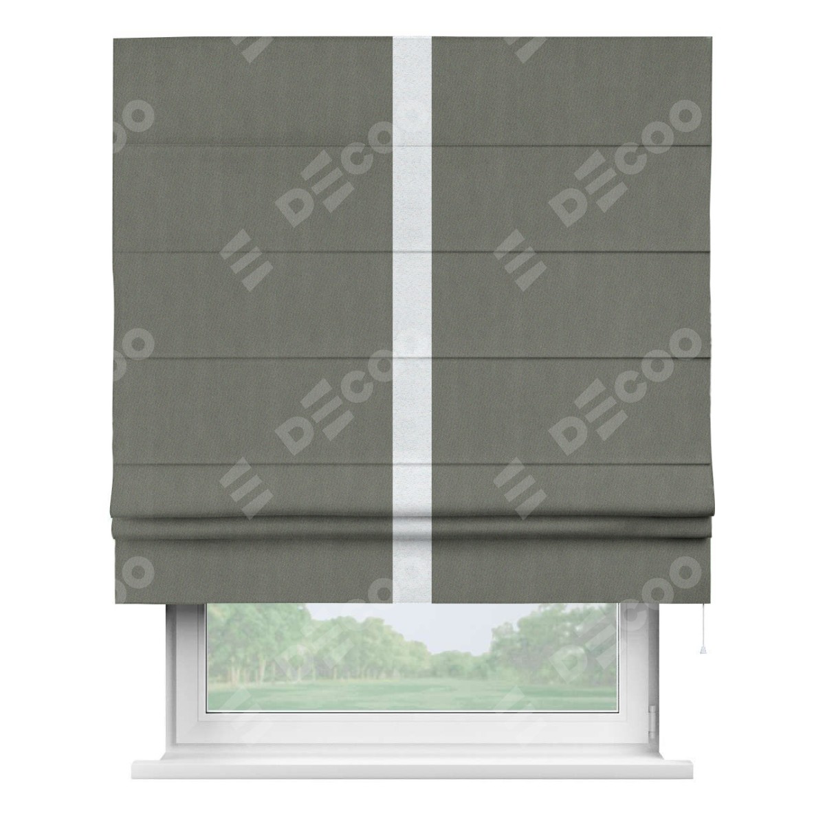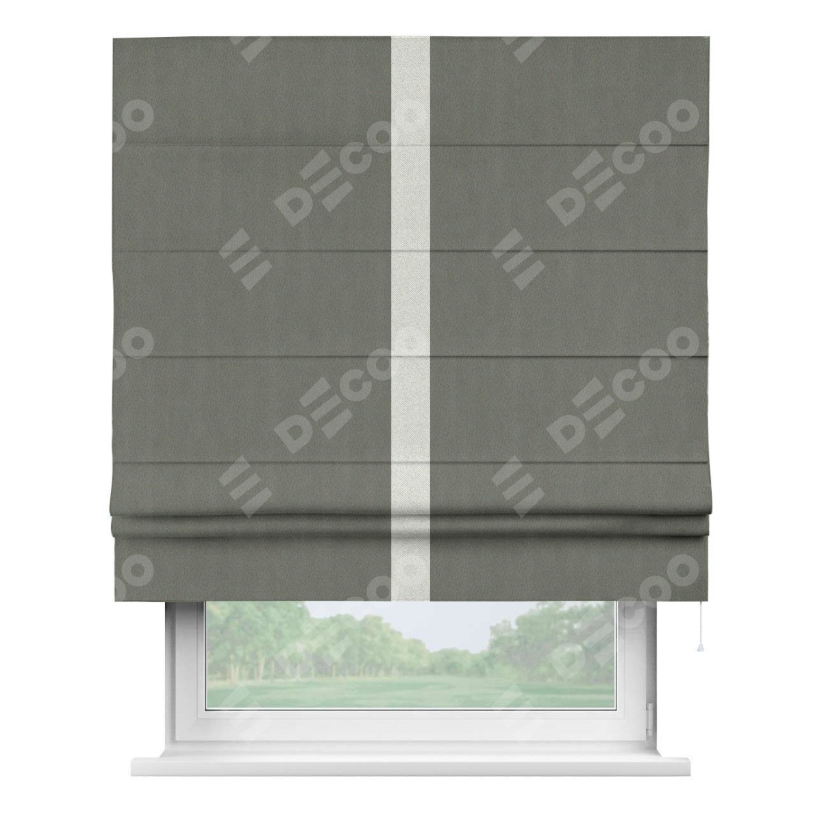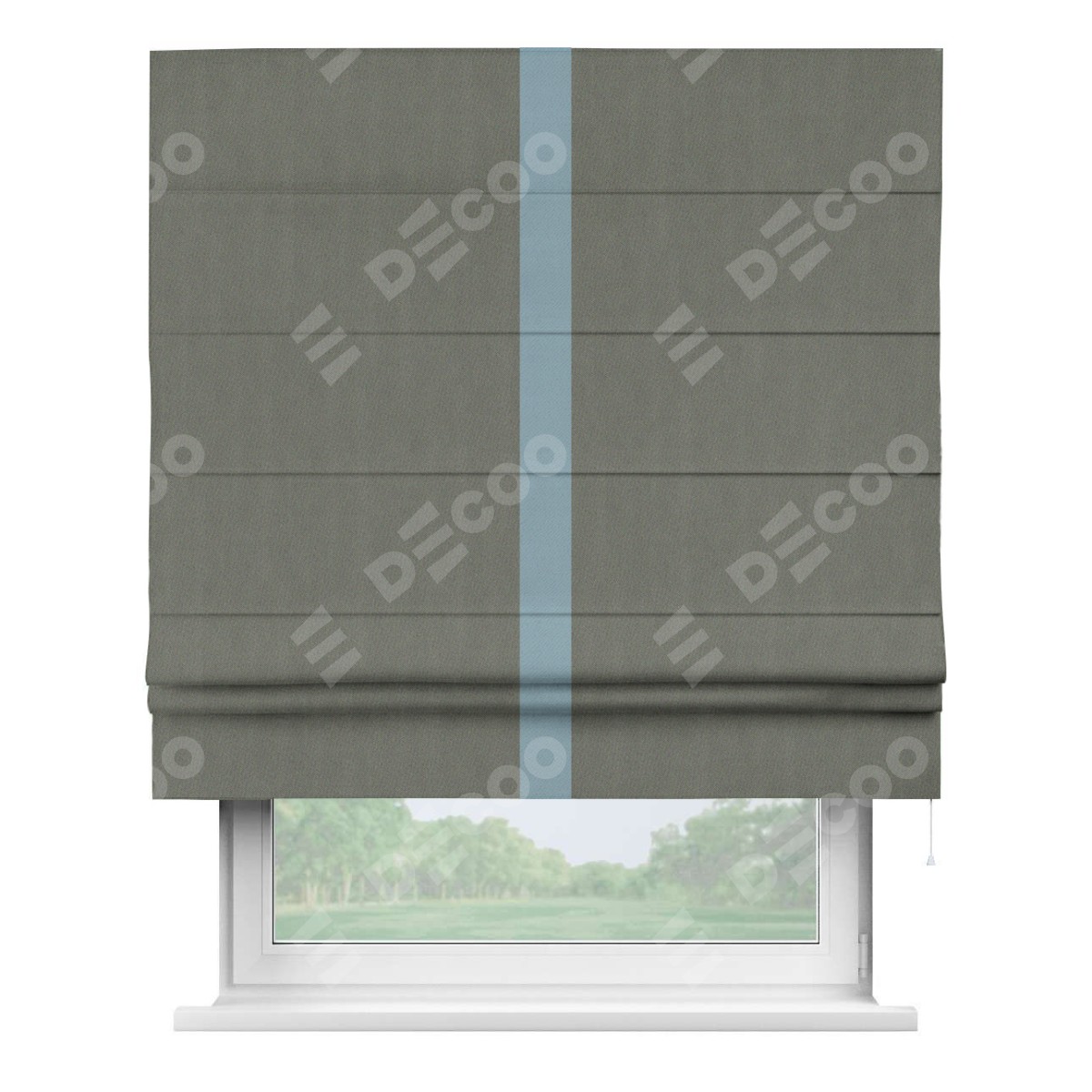 Римская штора производителя «Cortin», используется для проёма, пошита из ткани блэкаут однотонный тёмно-серый, артикул ткани 29332−1. Отделка шторы кантом «Хайвей», ткань для канта используется из блэкаута однотонного разной расцветки на выбор. Имеет универсальный механизм и подходит для монтажа: на потолок, на стену и в нишу.