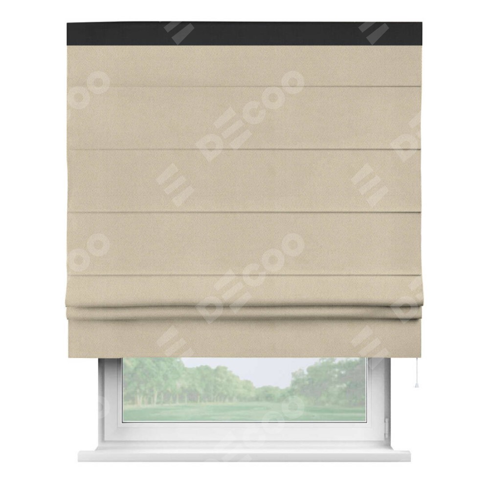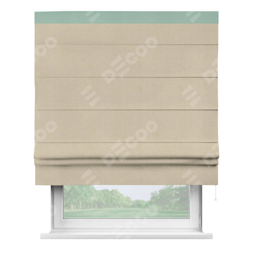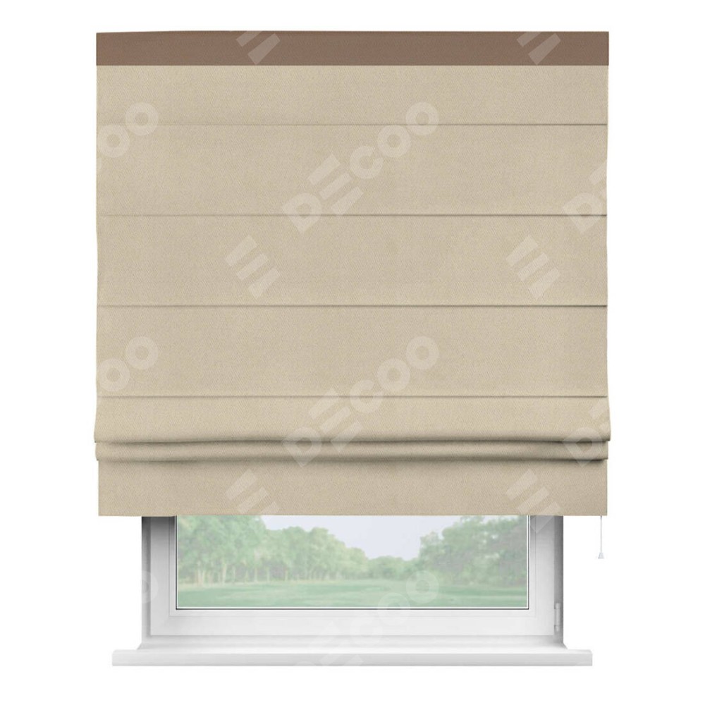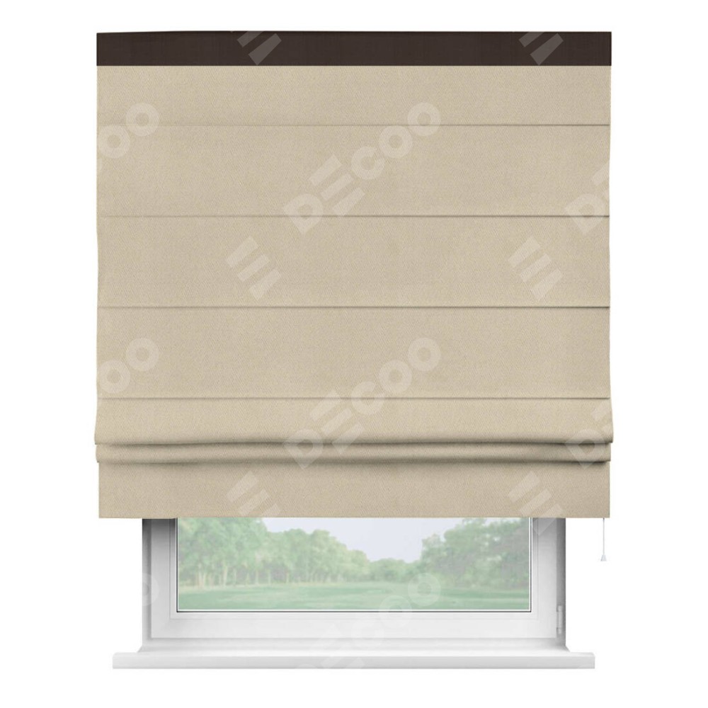 Римская штора производителя «Cortin», используется для проёма, пошита из ткани блэкаут однотонный кофейно-бежевый, артикул ткани 12095−1. Отделка шторы кантом «Кинг», ткань для канта используется из блэкаута однотонного разной расцветки на выбор. Имеет универсальный механизм и подходит для монтажа: на потолок, на стену и в нишу.
