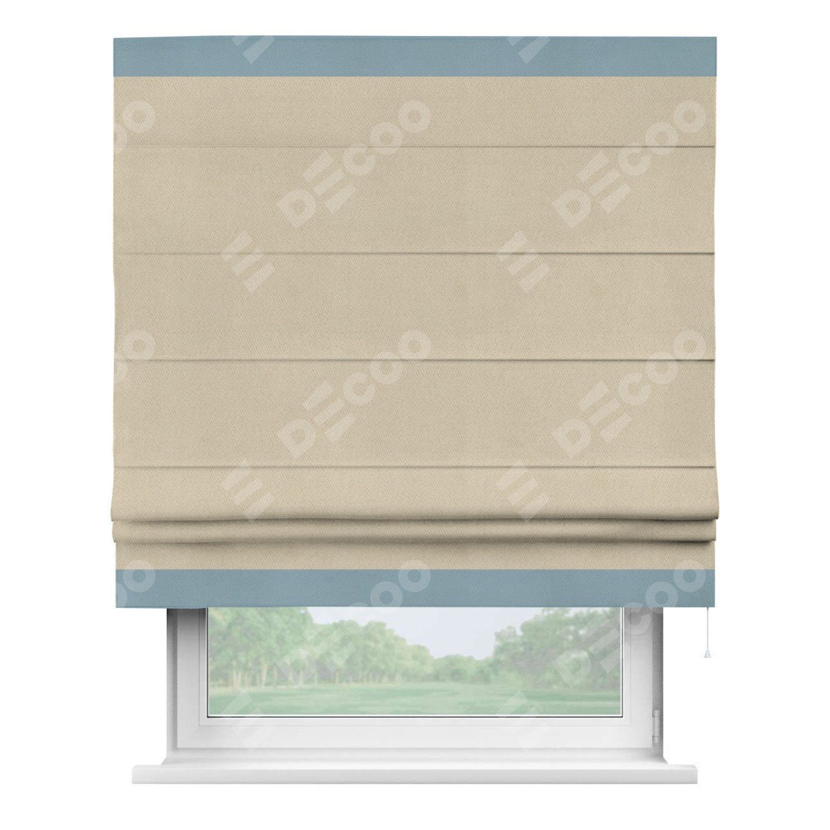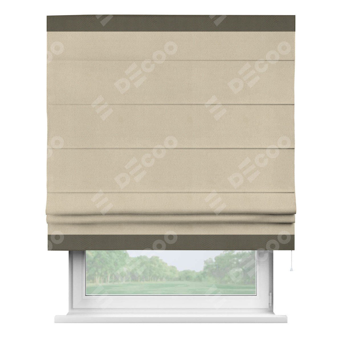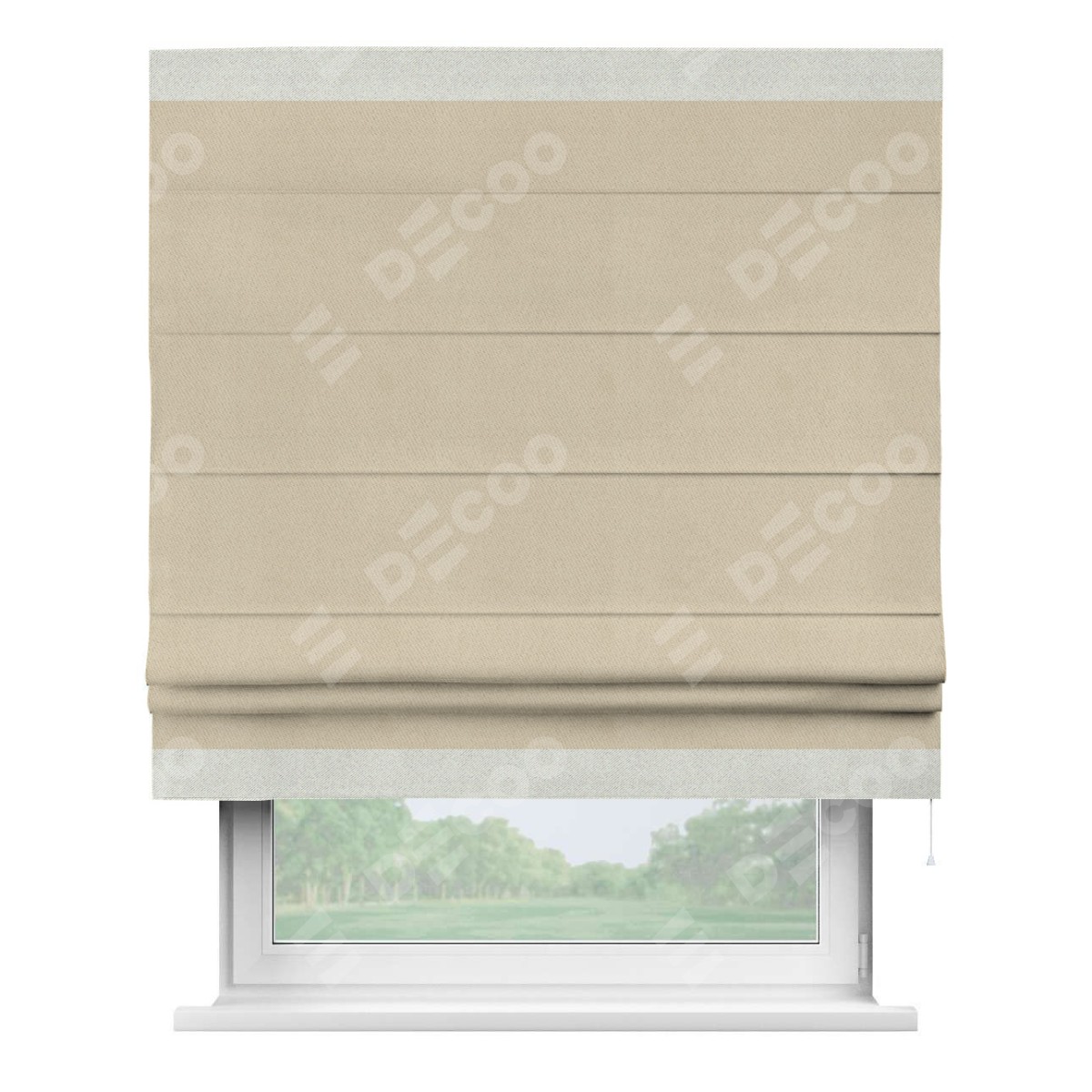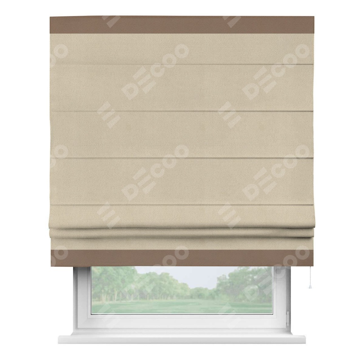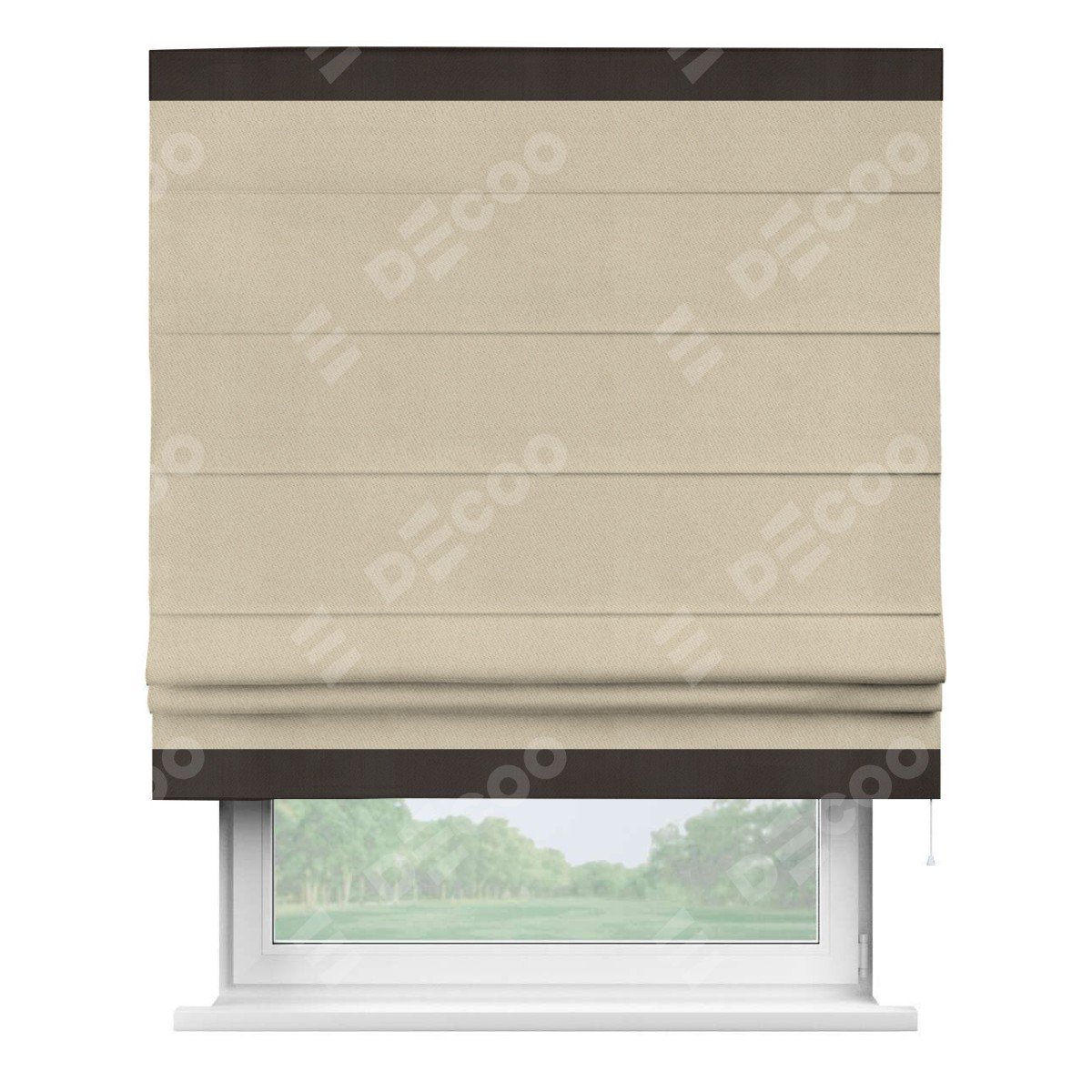 Римская штора производителя «Cortin», используется для проёма, пошита из ткани блэкаут однотонный кофейно-бежевый, артикул ткани 12095−1. Отделка шторы кантом «Горизонт», ткань для канта используется из блэкаута однотонного разной расцветки на выбор. Имеет универсальный механизм и подходит для монтажа: на потолок, на стену и в нишу.
