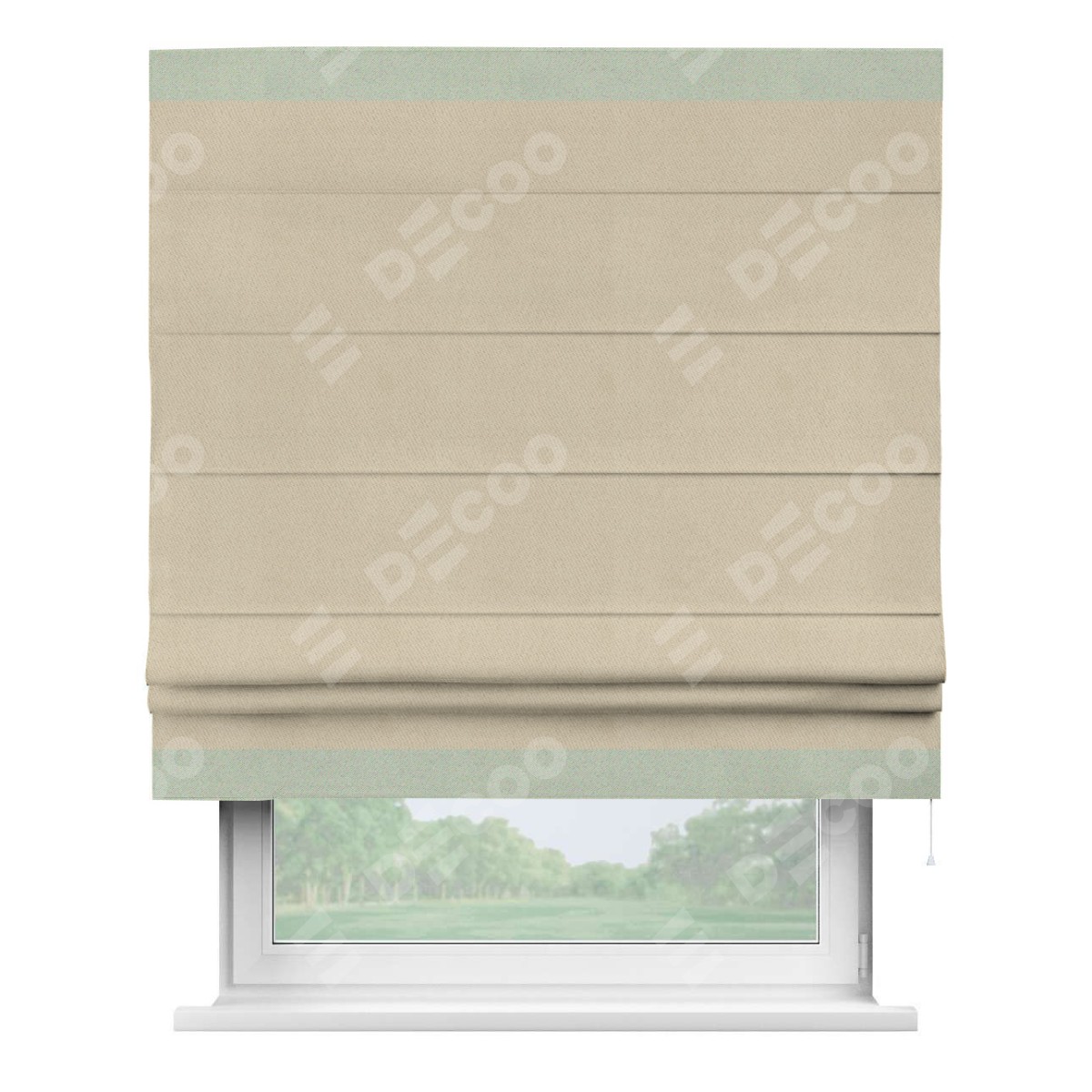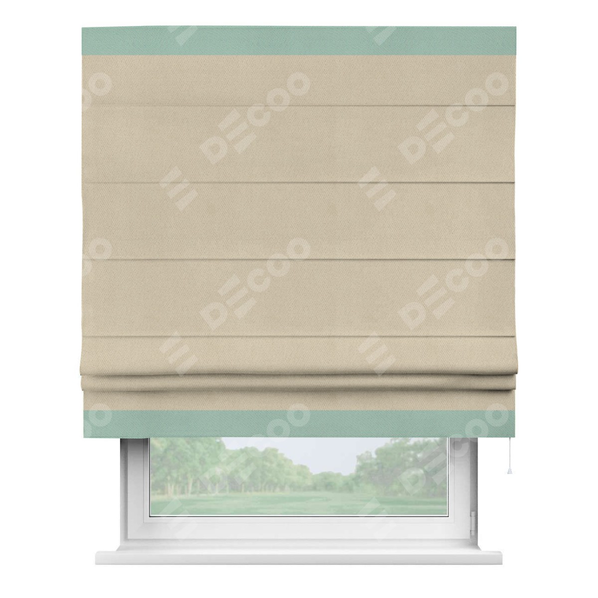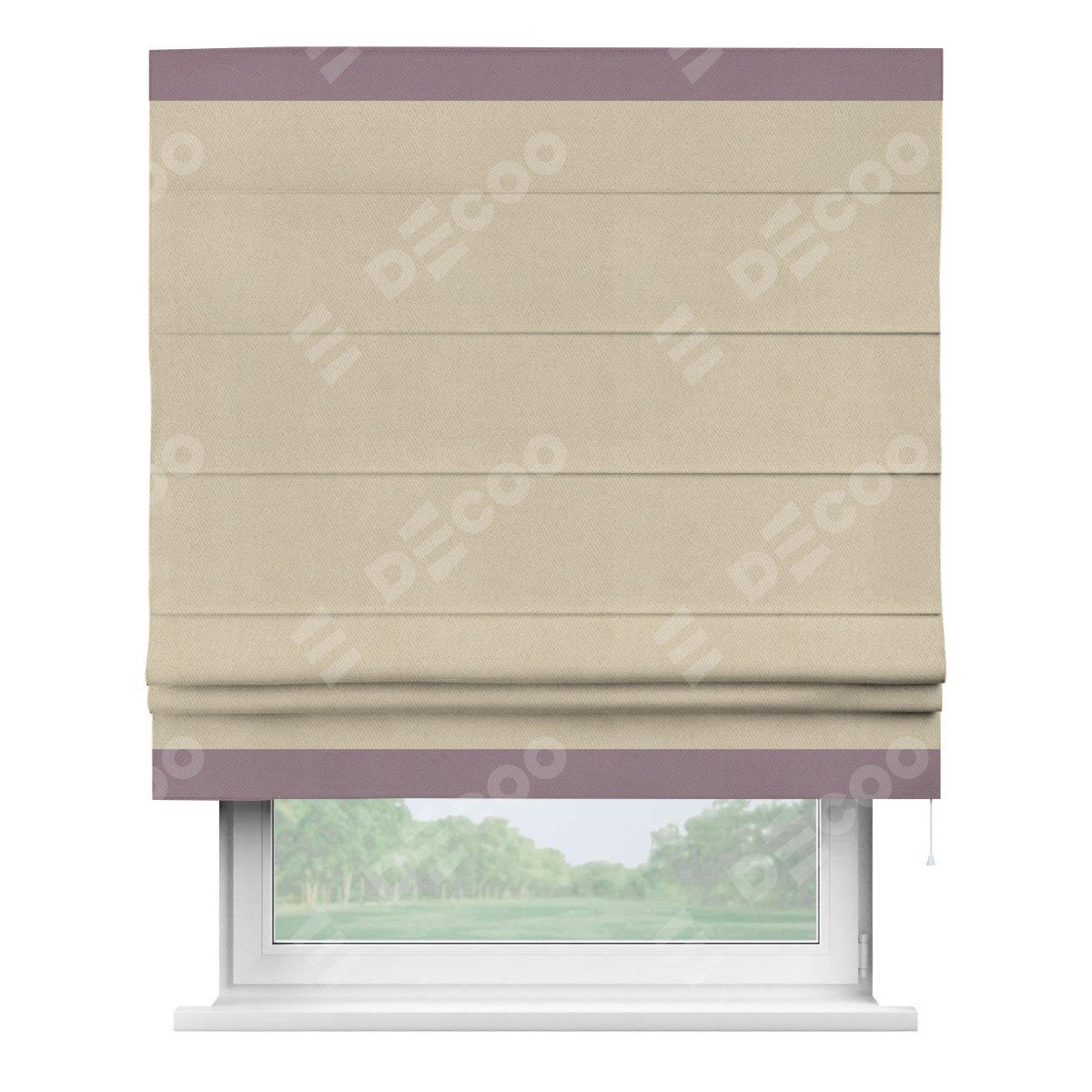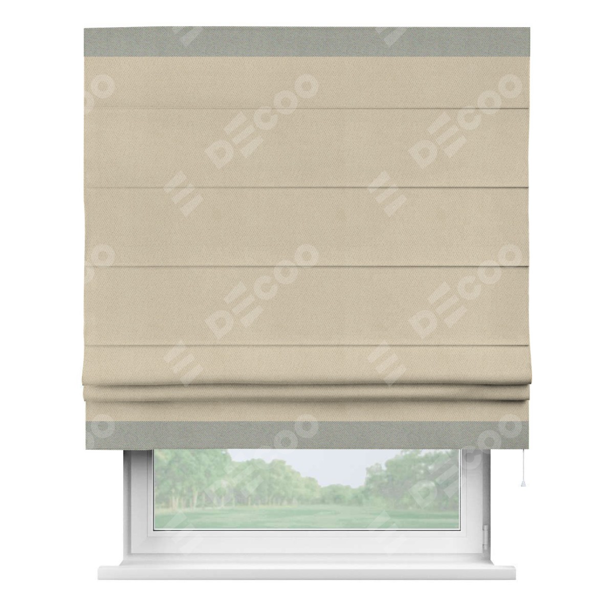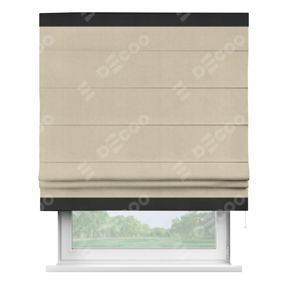 Римская штора производителя «Cortin», используется для проёма, пошита из ткани блэкаут однотонный кофейно-бежевый, артикул ткани 12095−1. Отделка шторы кантом «Горизонт», ткань для канта используется из блэкаута однотонного разной расцветки на выбор. Имеет универсальный механизм и подходит для монтажа: на потолок, на стену и в нишу.