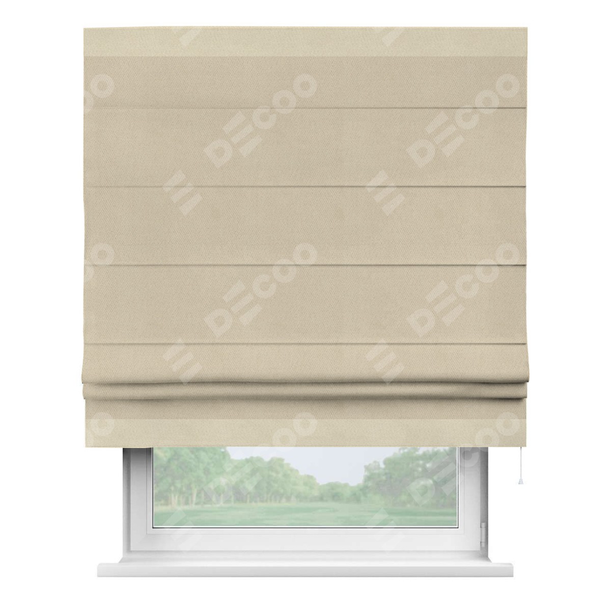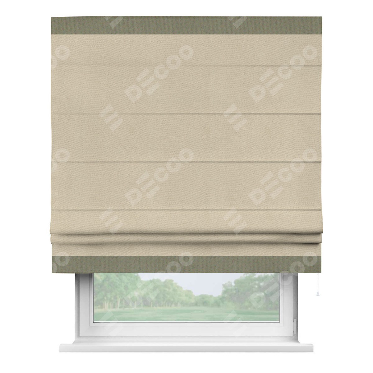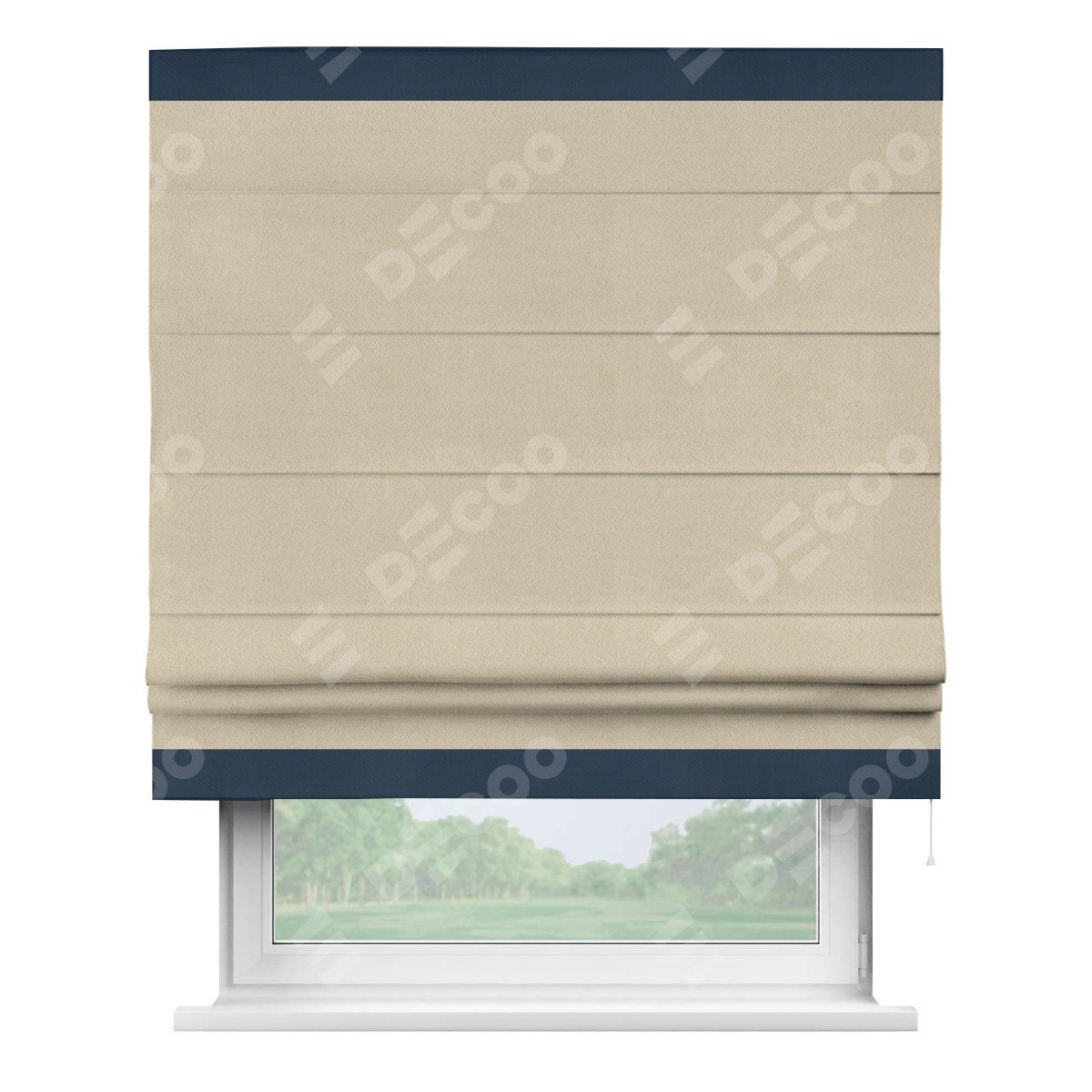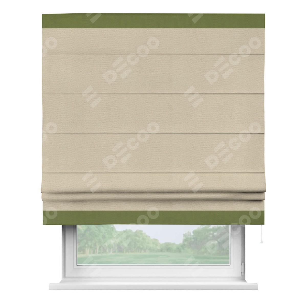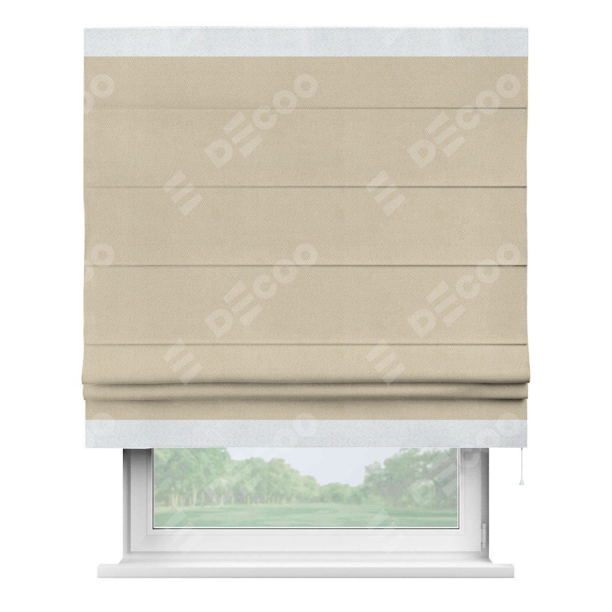 Римская штора производителя «Cortin», используется для проёма, пошита из ткани блэкаут однотонный кофейно-бежевый, артикул ткани 12095−1. Отделка шторы кантом «Горизонт», ткань для канта используется из блэкаута однотонного разной расцветки на выбор. Имеет универсальный механизм и подходит для монтажа: на потолок, на стену и в нишу.