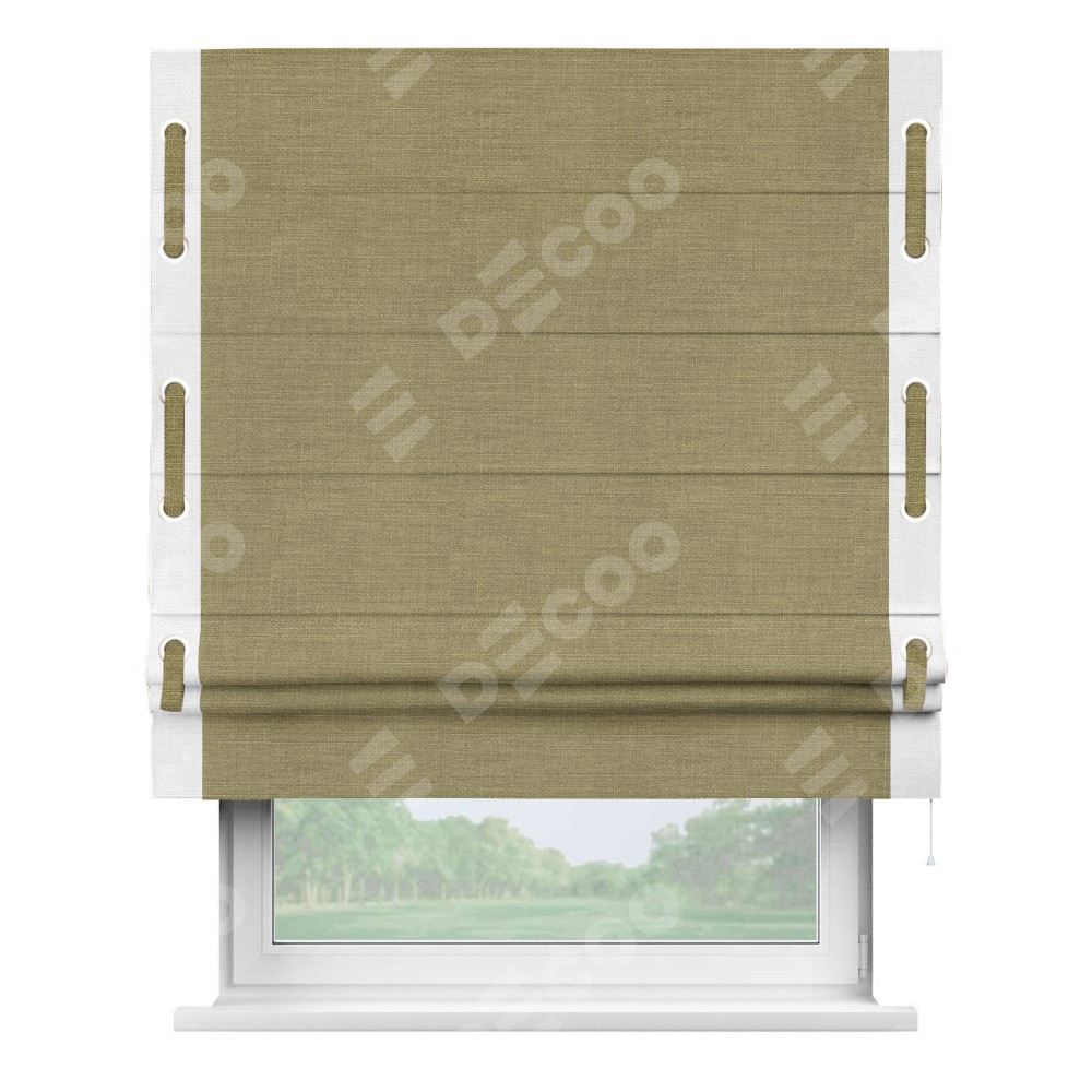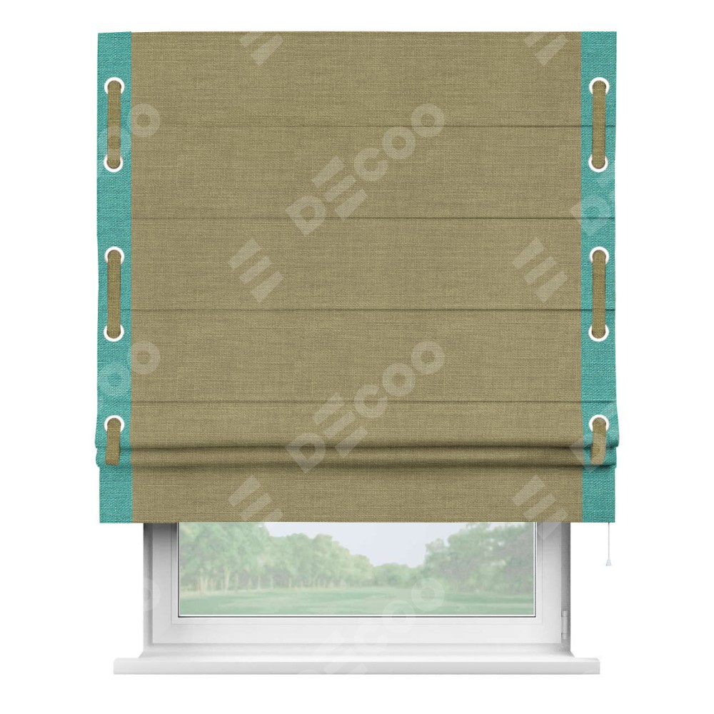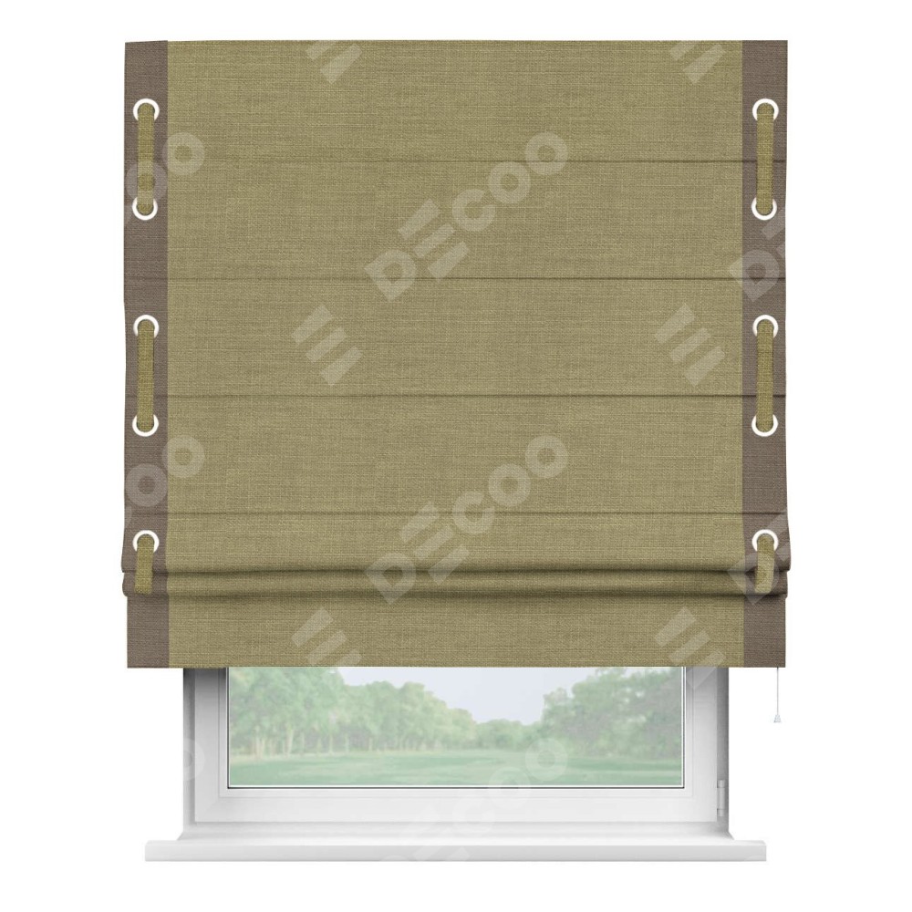 Римская штора производителя «Cortin», используется для проёма, пошита из ткани лён коричневый, артикул 7443. Отделка шторы кантом «Стрим Дуо» на кантах расположены люверсы с пояском, ткань для канта используется из льна разной расцветки на выбор. Ткань для пояска обычно используется из основной ткани шторы, а так же можно сделать из любой расцветки по желанию. Имеет универсальный механизм и подходит для монтажа: на потолок, на стену и в нишу.