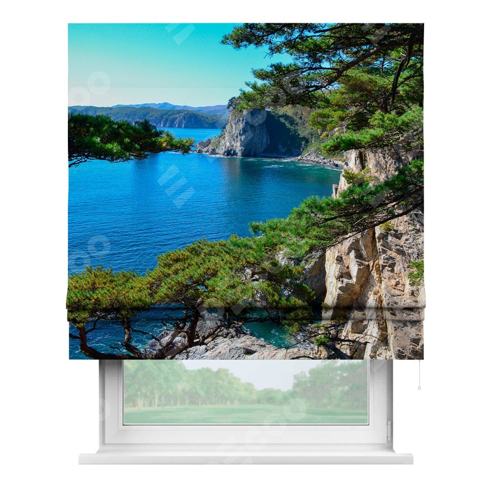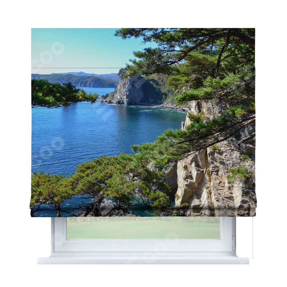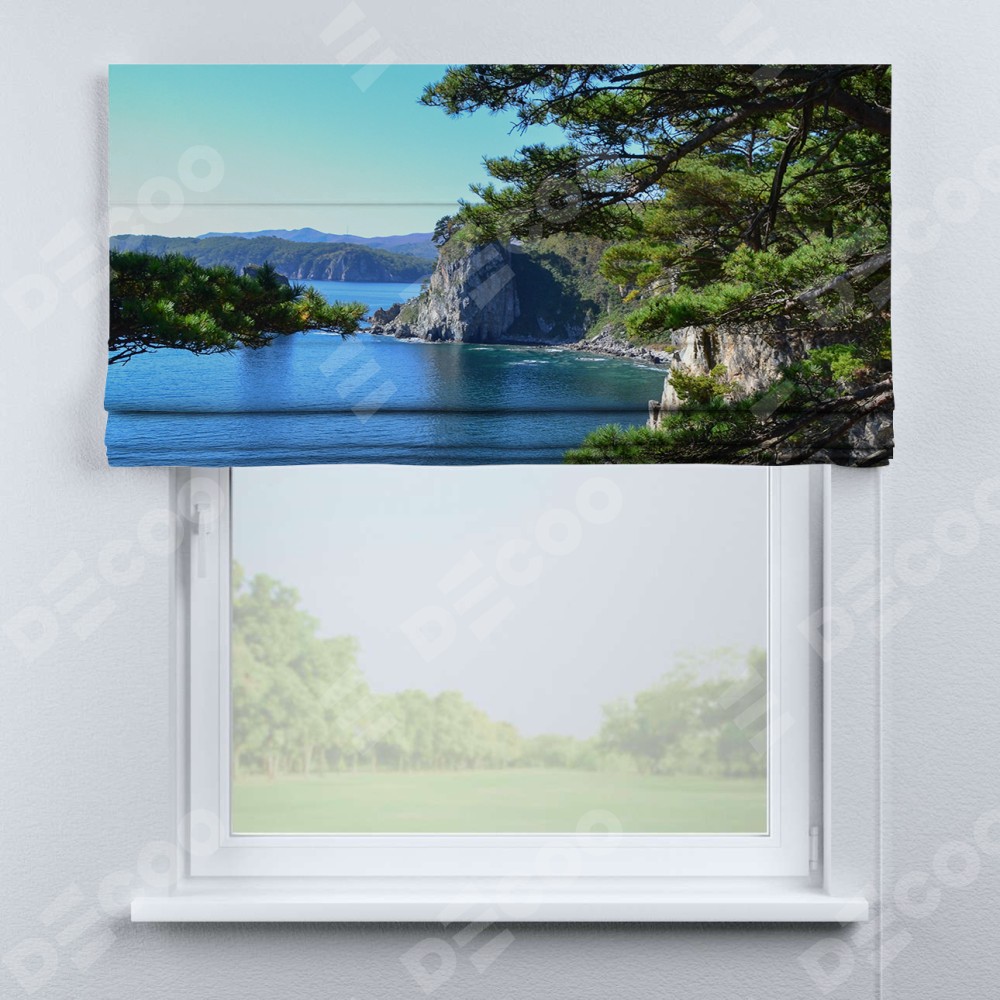 Римская штора производителя «Cortin», используется для проёма, пошита из ткани блэкаут с нанесением сублимационной печати «Море и сосны». Имеет универсальный механизм и подходит для монтажа: на потолок, на стену и в нишу.
