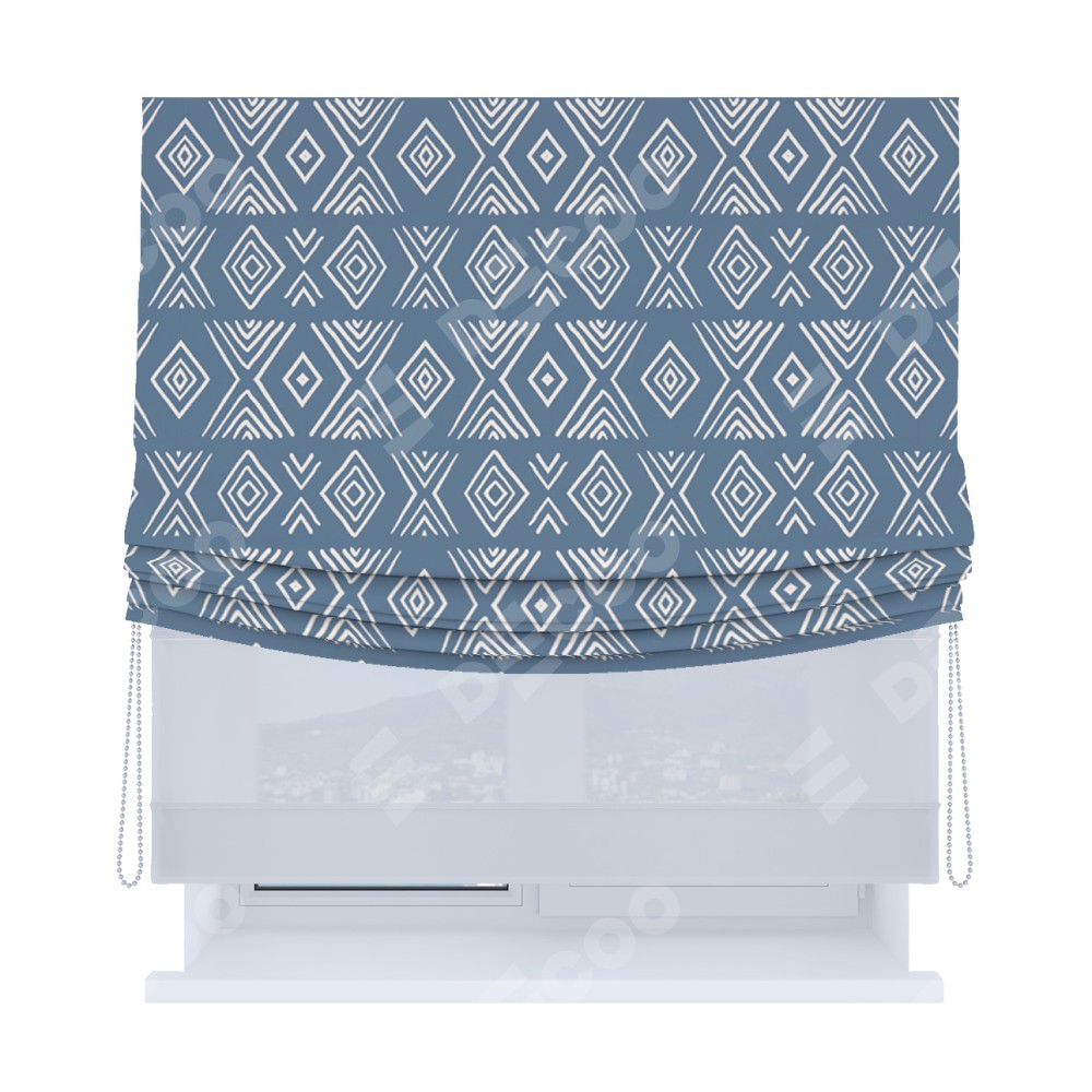 Римская штора день-ночь производителя «Cortin», используется для проёма, пошита из двух полотен, с лицевой блэкаут с нанесением сублимационной печати «Графический орнамент», вторая ткань тюль (по стандарту комплектуется тюль белого цвета артикул V-01). Имеет универсальный механизм и подходит для монтажа: на потолок, на стену и в нишу. Удобное управление каждой шторой отдельно.
