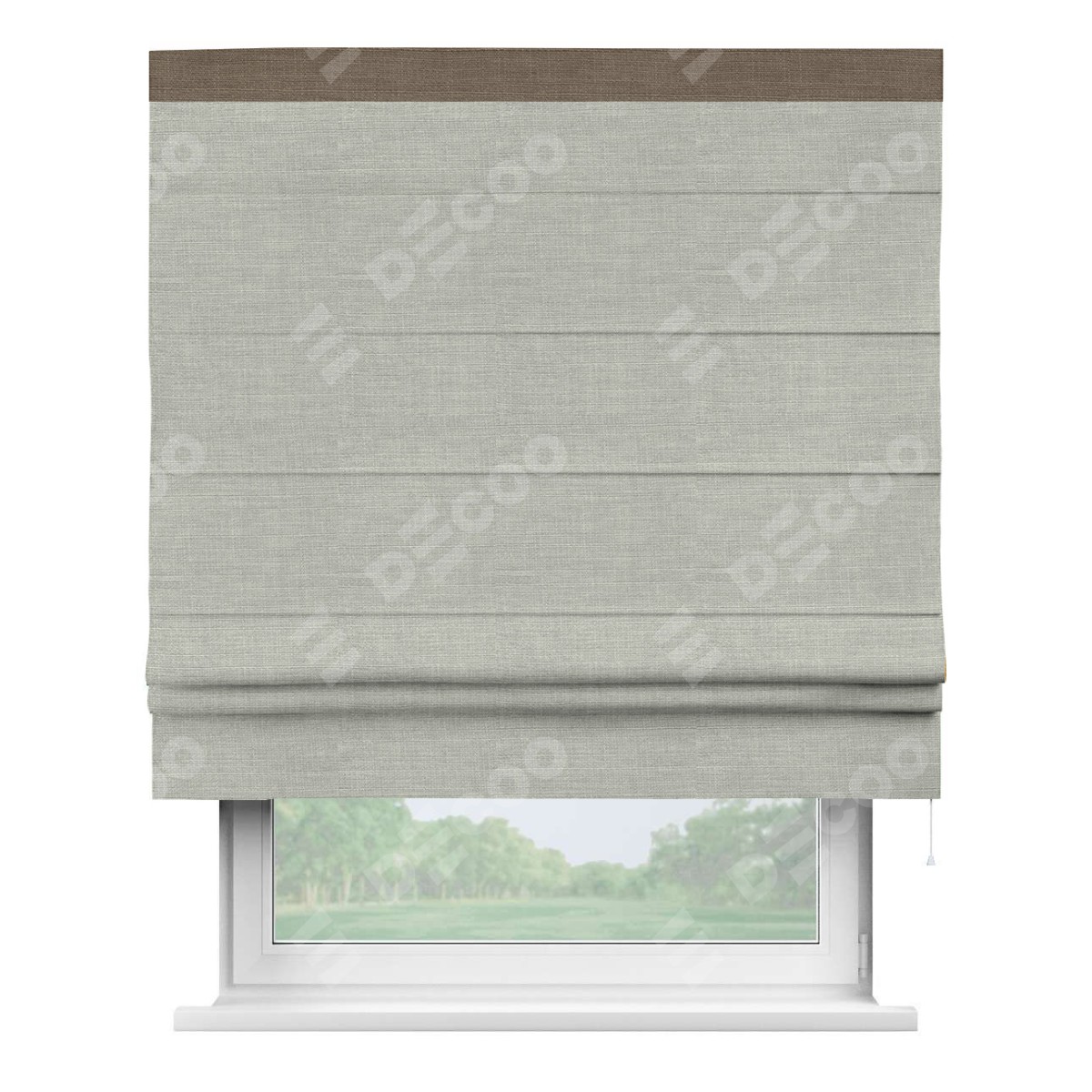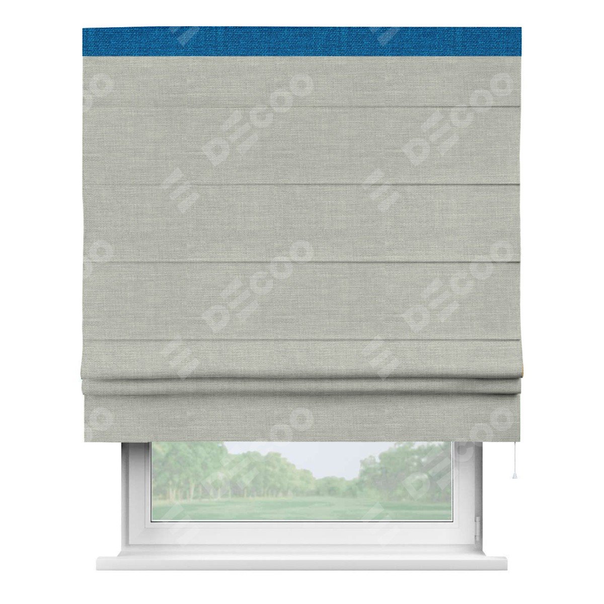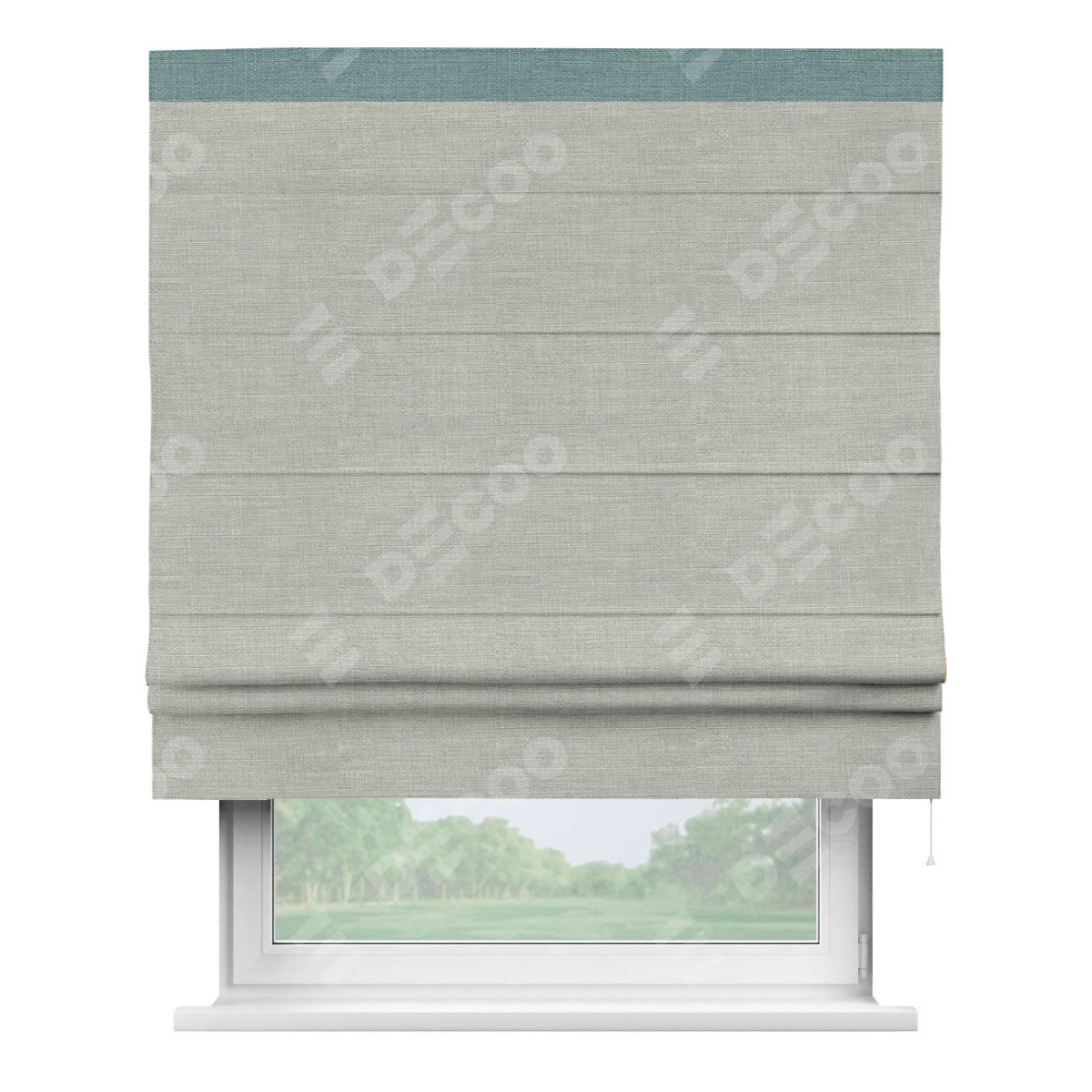 Римская штора производителя «Cortin», используется для проёма, пошита из ткани лён серый, артикул 7440. Отделка шторы кантом «Кинг», ткань для канта используется из льна разной расцветки на выбор. Имеет универсальный механизм и подходит для монтажа: на потолок, на стену и в нишу.