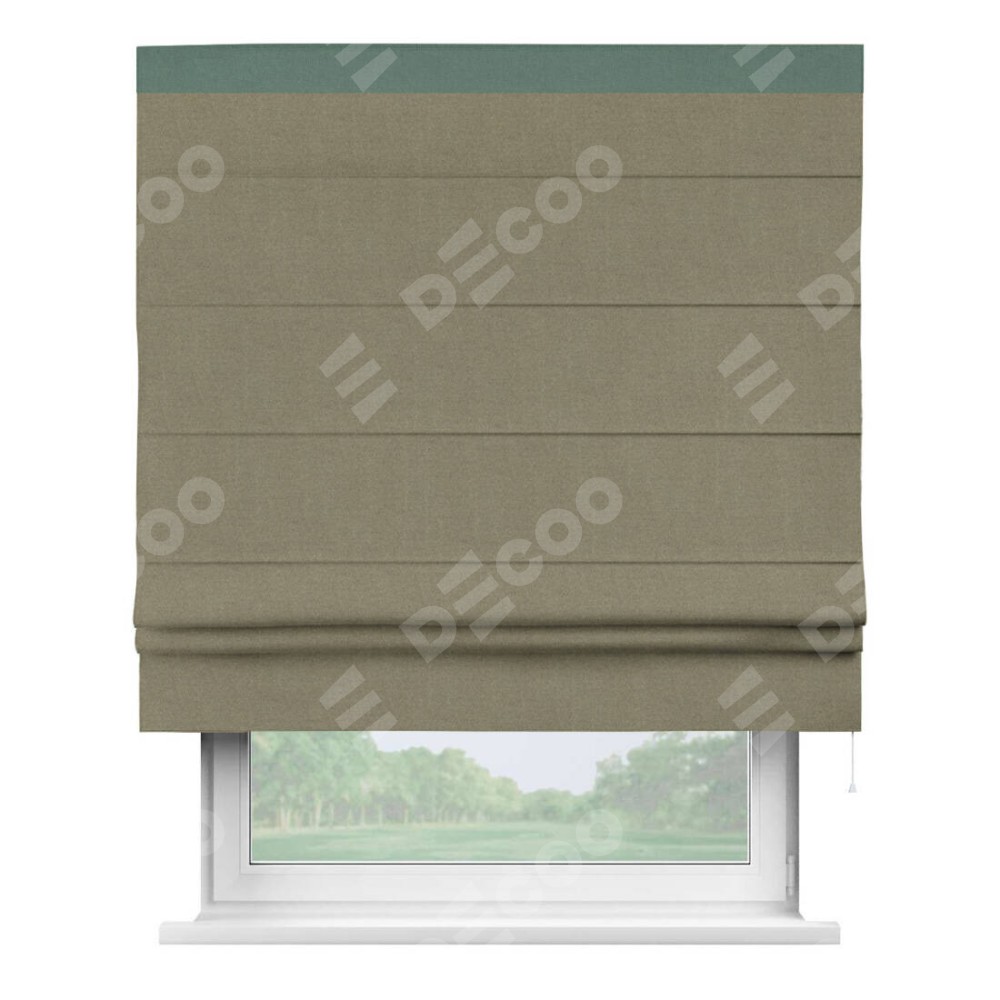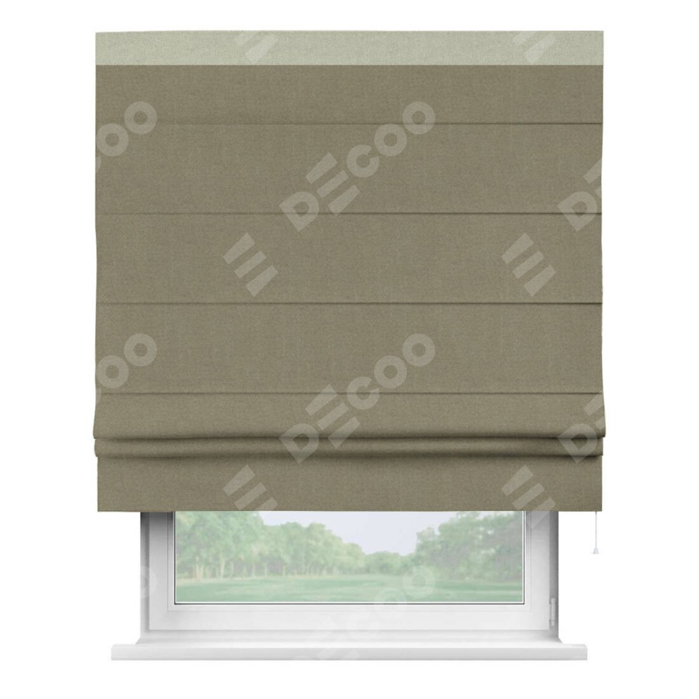 Римская штора производителя «Cortin», используется для проёма, пошита из ткани лён блэкаут бежевый, артикул 69435. Отделка шторы кантом «Кинг», ткань для канта используется из льна разной расцветки на выбор. Имеет универсальный механизм и подходит для монтажа: на потолок, на стену и в нишу.