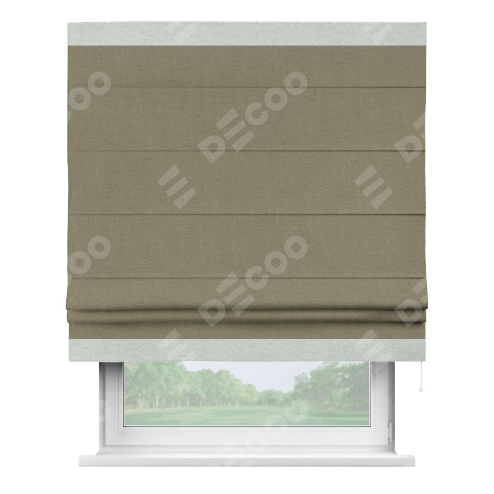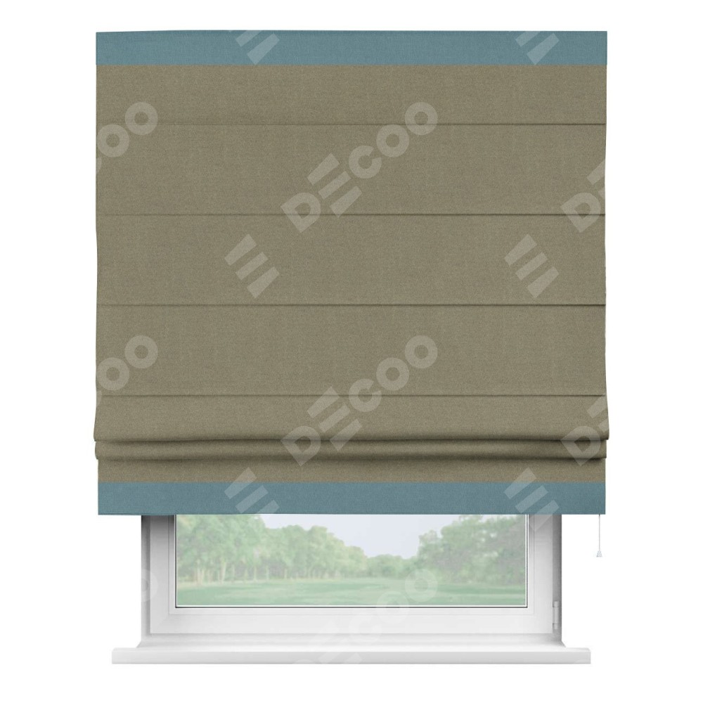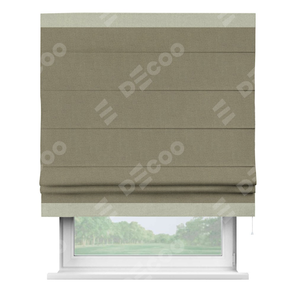 Римская штора производителя «Cortin», используется для проёма, пошита из ткани лён блэкаут бежевый, артикул 69435. Отделка шторы кантом «Горизонт», ткань для канта используется из льна разной расцветки на выбор. Имеет универсальный механизм и подходит для монтажа: на потолок, на стену и в нишу.