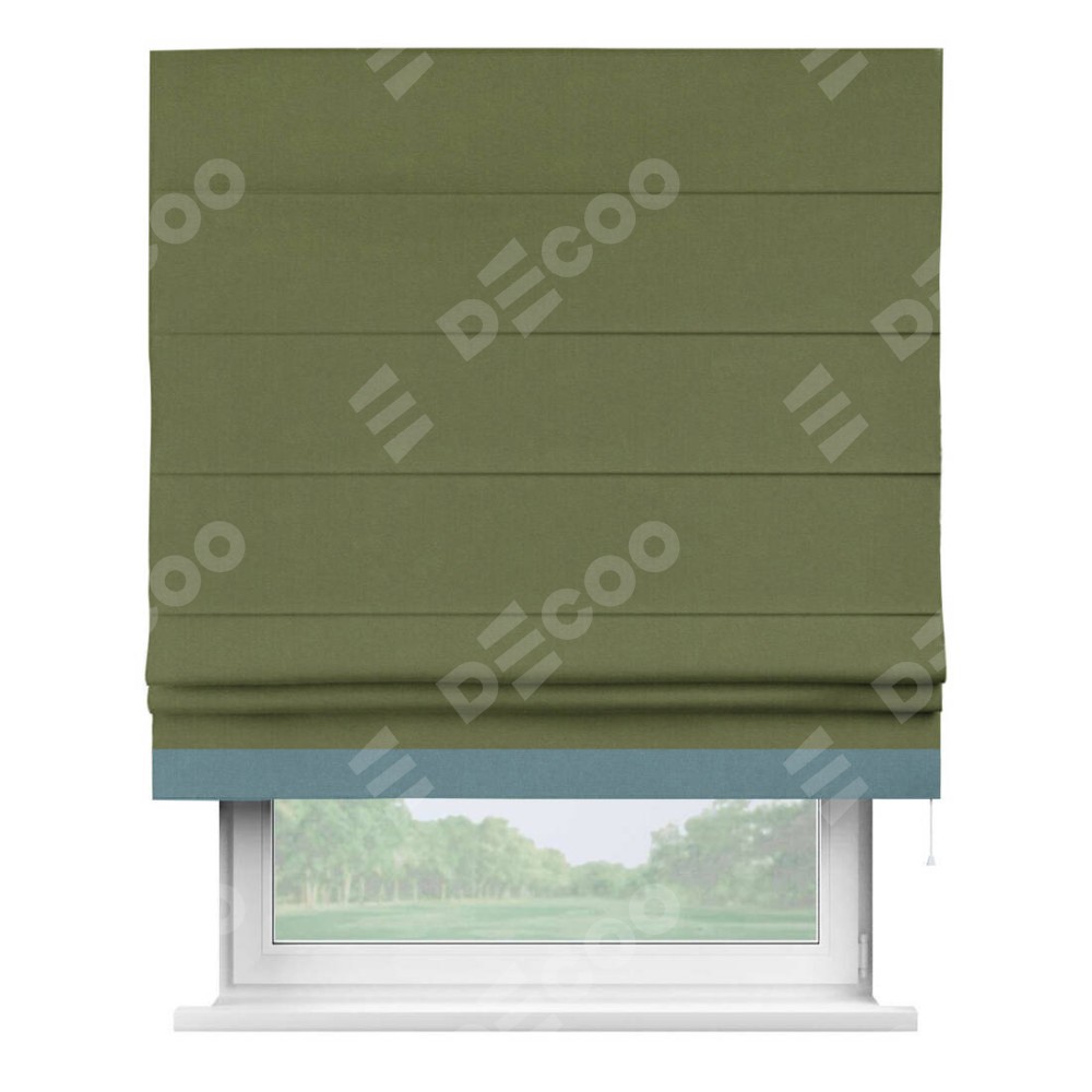 Римская штора производителя «Cortin», используется для проёма, пошита из ткани лён блэкаут оливковый, артикул 69516. Отделка шторы кантом «Джестер», ткань для канта используется из льна разной расцветки на выбор. Имеет универсальный механизм и подходит для монтажа: на потолок, на стену и в нишу.