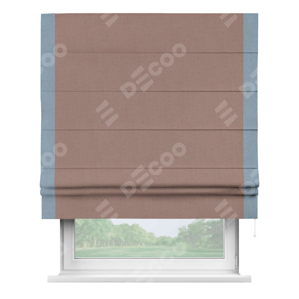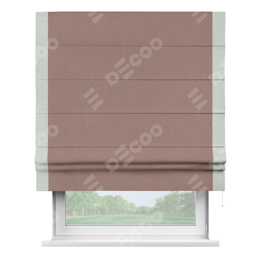 Римская штора производителя «Cortin», используется для проёма, пошита из ткани лён блэкаут розовый, артикул 69575. Отделка шторы кантом «Стрим Дуо», ткань для канта используется из льна разной расцветки на выбор. Имеет универсальный механизм и подходит для монтажа: на потолок, на стену и в нишу.